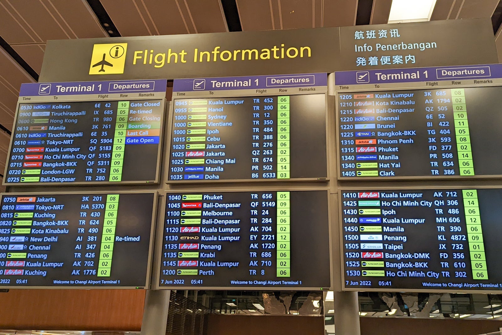 Aware of Scoot's frustratingly strict 60-minute baggage drop deadline, I arrived at Terminal 1 just before 6 a.m. Even at that early hour, Changi was a hive of activity with multiple Scoot flights departing within a few hours of each other.