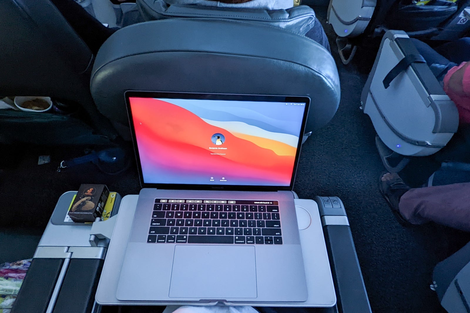 My 15-inch laptop fit on the tray table that folded out from its non-aisle armrest and I could still use it while the passenger in front was fully reclined thanks to the generous legroom.