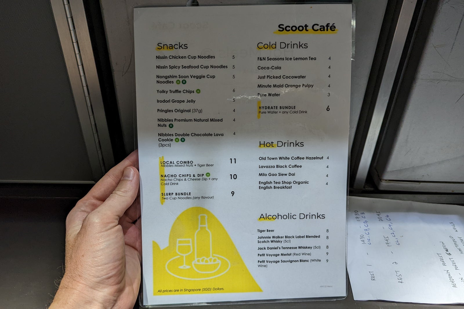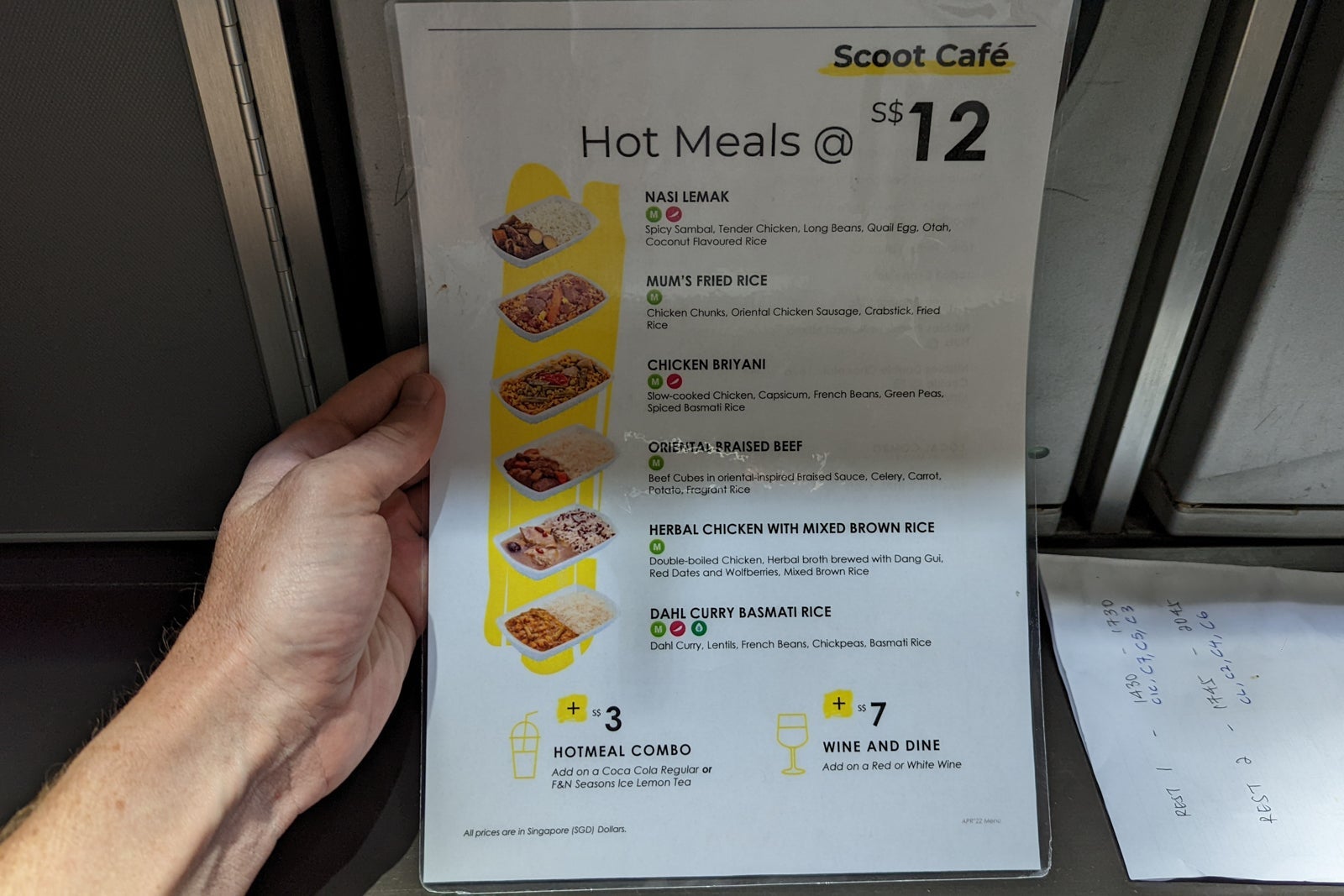 Five hours after my second meal, and with four hours still to fly, I was hungry again. ScootPlus passengers are only provided with one complimentary meal per sector — everything else must be purchased. I tracked down a menu that was only a range of the same microwave meals I had already eaten and some snacks. I didn't particularly enjoy either of the first two hot meals so wasn't keen to spend another SG$12 ($8.60) on a third.