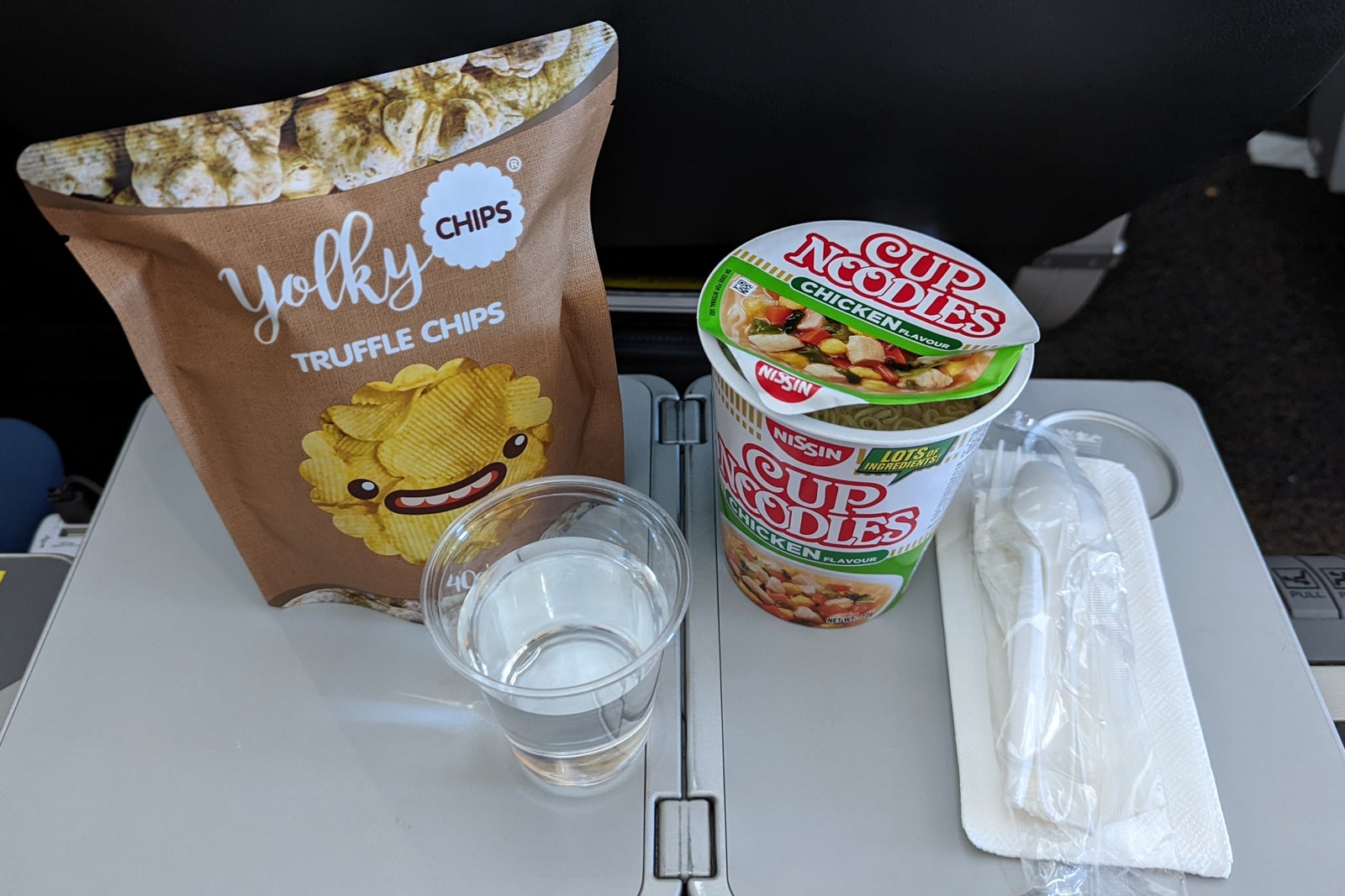 There wasn't a lot that excited me on the snack menu, so I settled on a cup of chicken-flavored Nissin Cup Noodles (SG$5, $3) and some truffle potato chips (SG$6, $4.31). These were served with a free glass of water (ice had run out by this stage). Paying for ramen noodles was a stark reminder this was a budget carrier.