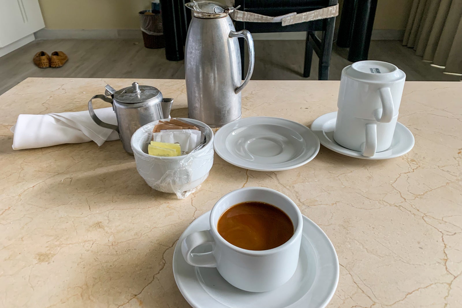 My "morning" coffee arrived more than an hour after I asked for it, and the waiter graciously offered to get the roach for me (which was still alive and kicking ... literally). He didn't seem surprised to see the bug at all which made me think this wasn't an isolated incident.