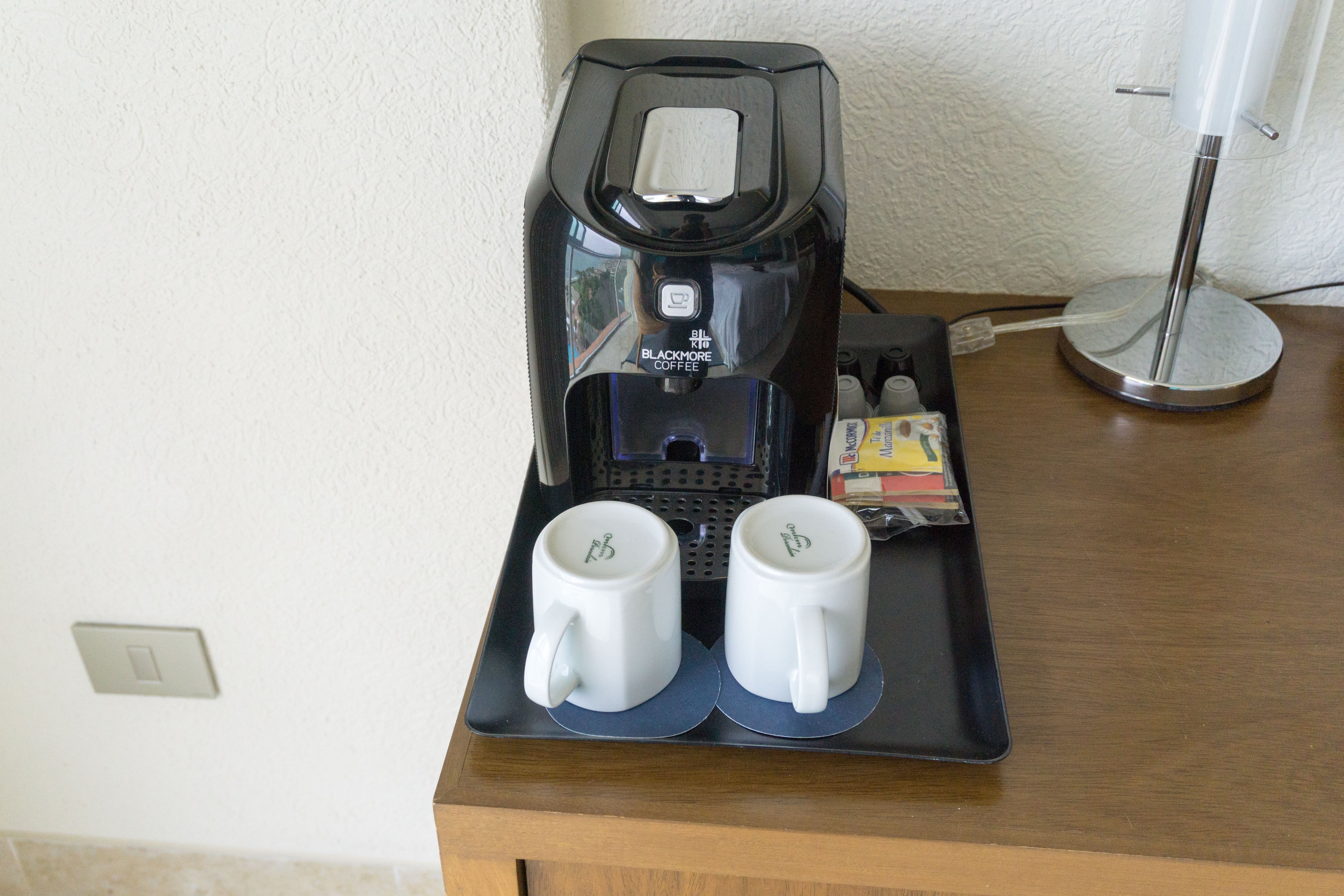 On the desk was a basic kettle and coffeemaker. The room was stocked with four water bottles.