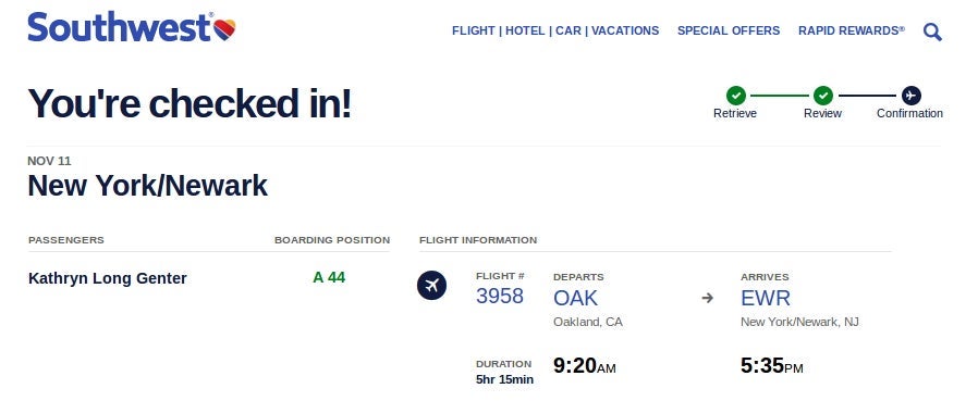 Southwest offers one nonstop flight from Oakland, California, to Newark, New Jersey, most days of the week. Here's my experience flying Southwest Airlines on this long transcon route -- one of the longest in the Southwest network.