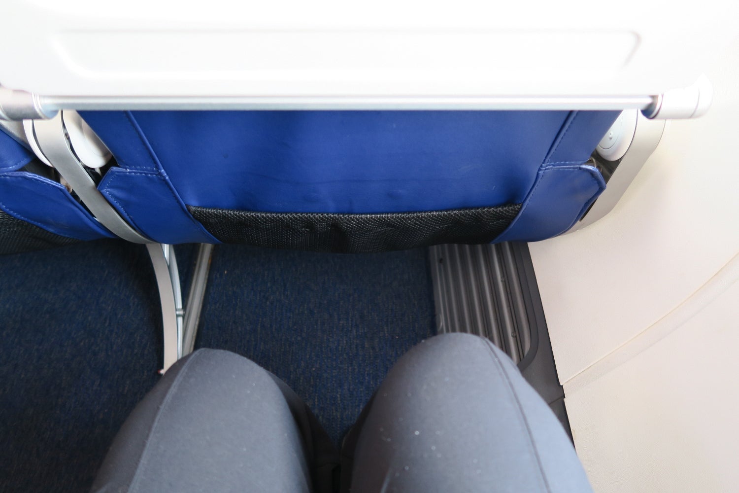 Under the seats, nothing blocked legroom or storage, since there was no power or IFE box. All seats had similar under-seat storage, although aisle seats seemed to have slightly less space.