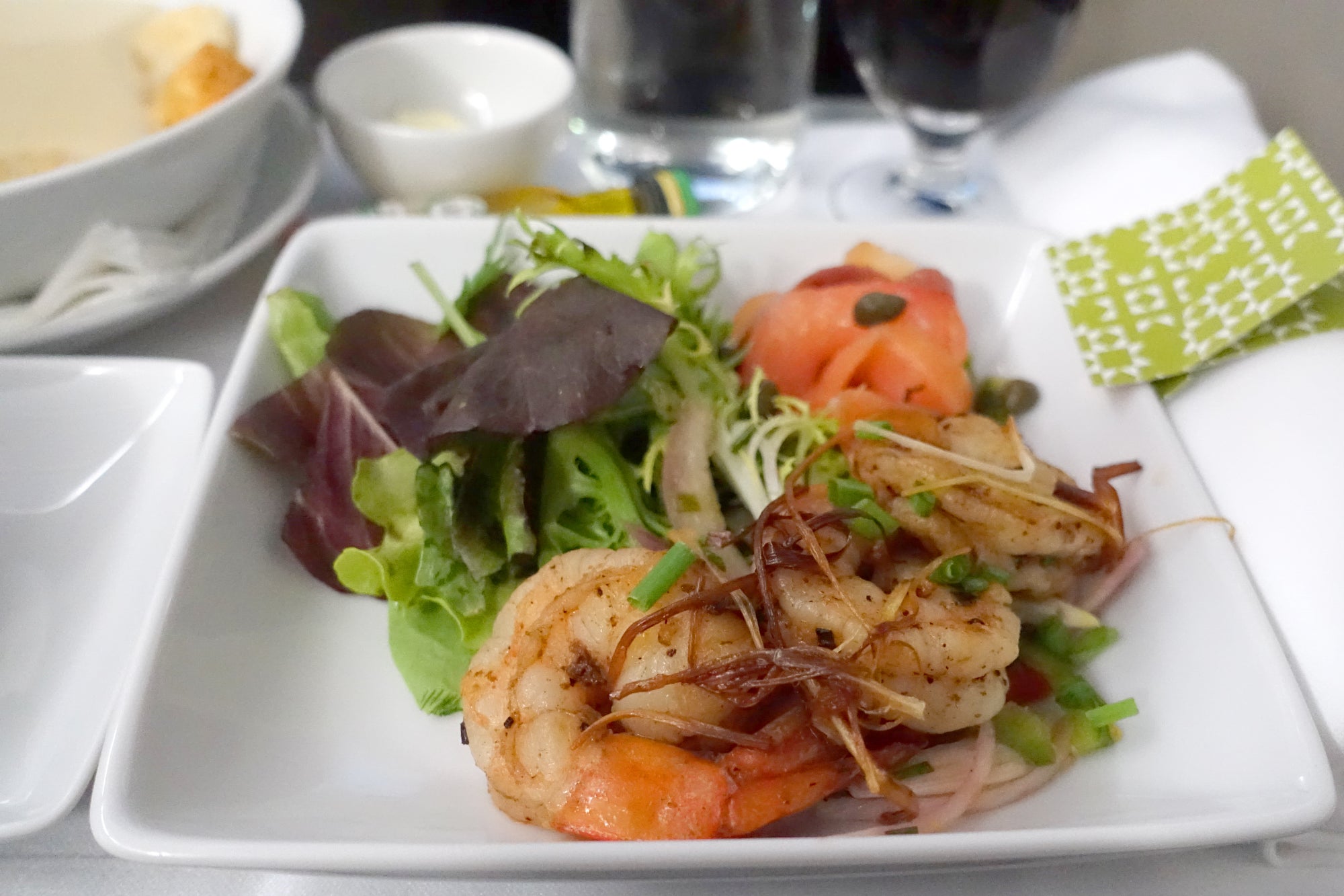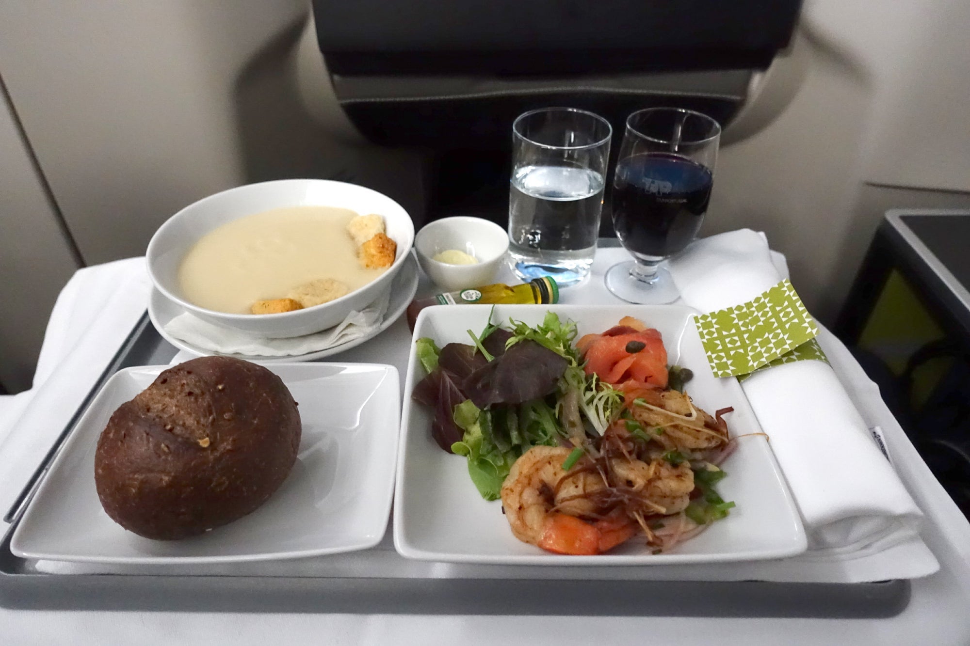 The appetizers and drink cart appeared on the other side of the cabin about 40 minutes after takeoff, with the crew reaching my seat some 15 minutes after that. I enjoyed the shrimp appetizer, but the soup was only lukewarm by the time it got to me, and the bread was cold.