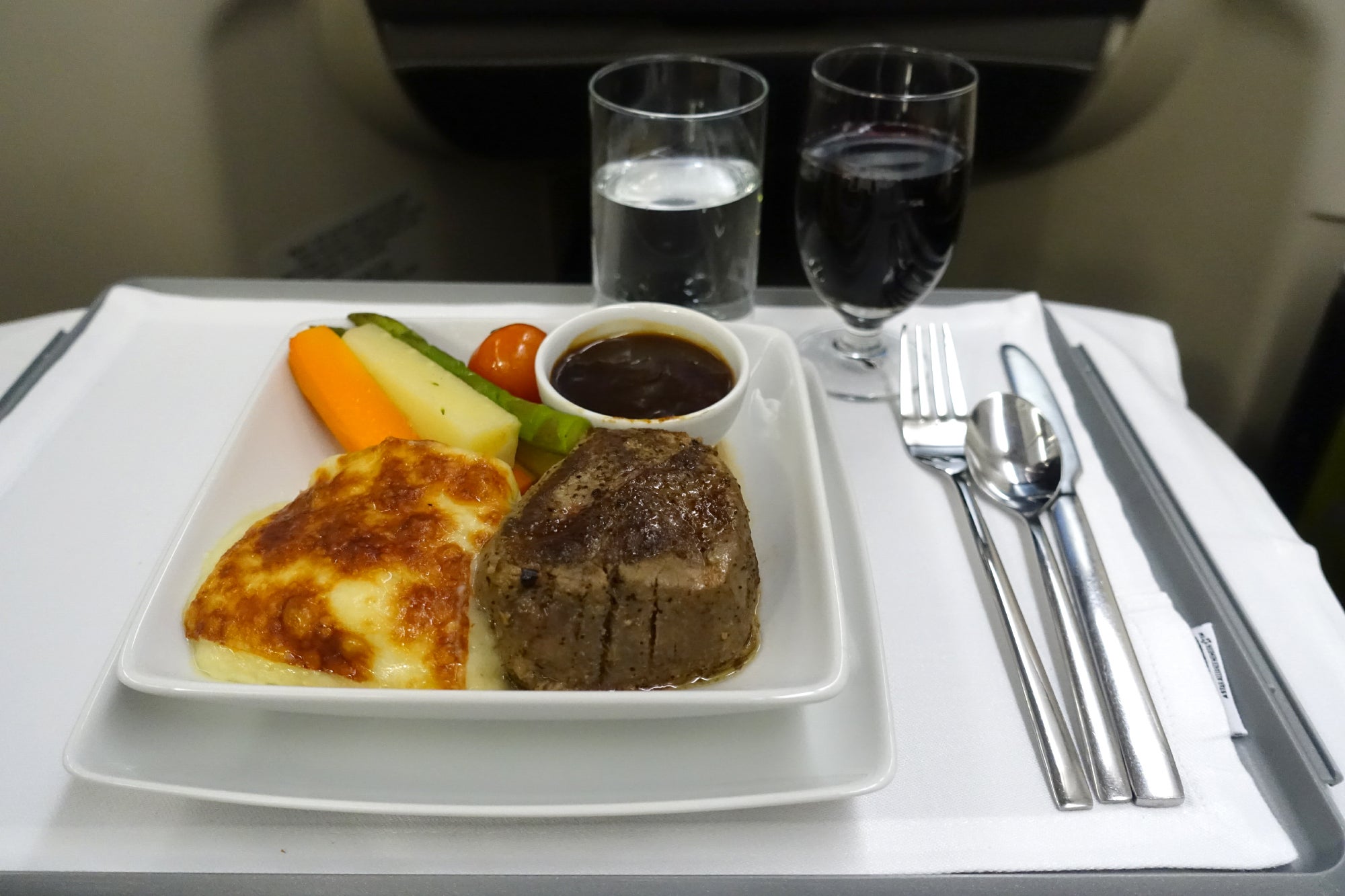 Similarly, the entree took too long to make its way from the other side of the cabin, sitting on the cart an extra 15 minutes. It was warm but not hot as a result, and the steak was tough, but I enjoyed the sauce quite a bit.