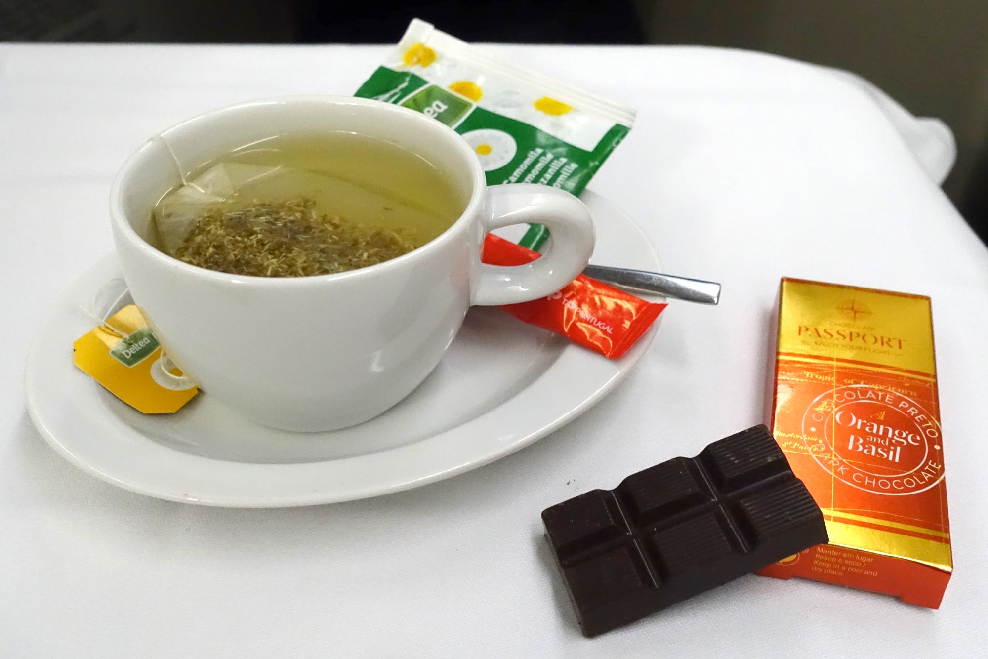 Finally, flight attendants came through with small boxes of chocolate, and I asked for some chamomile tea.