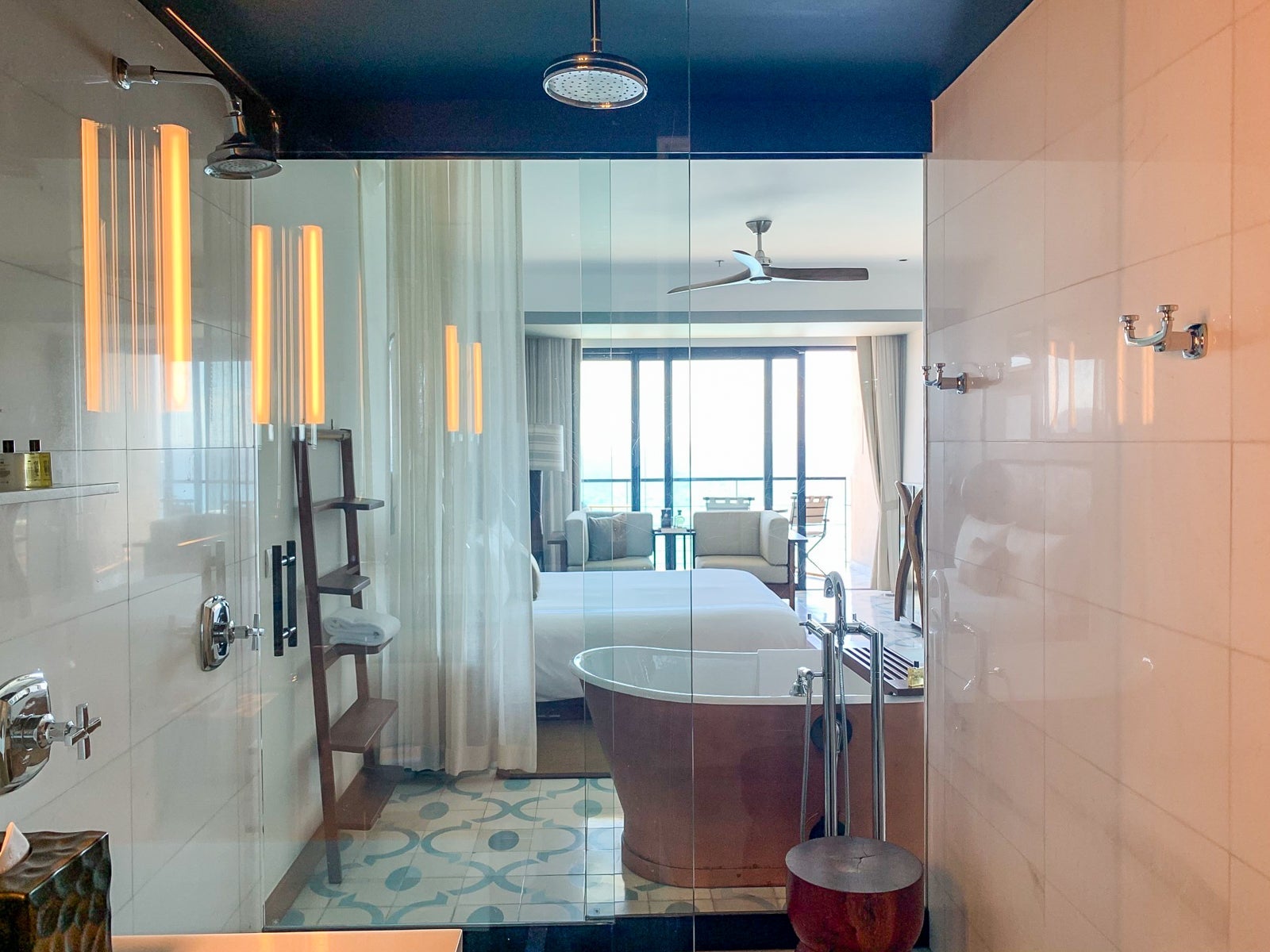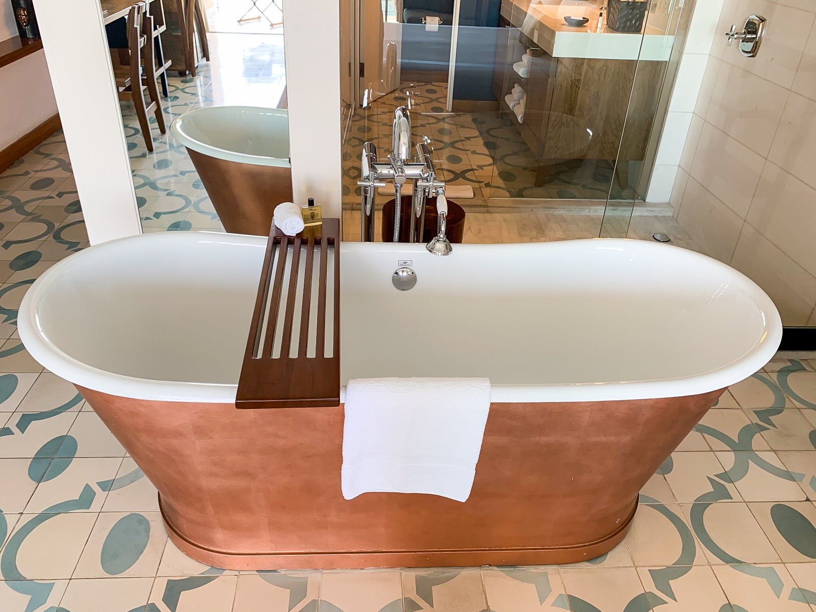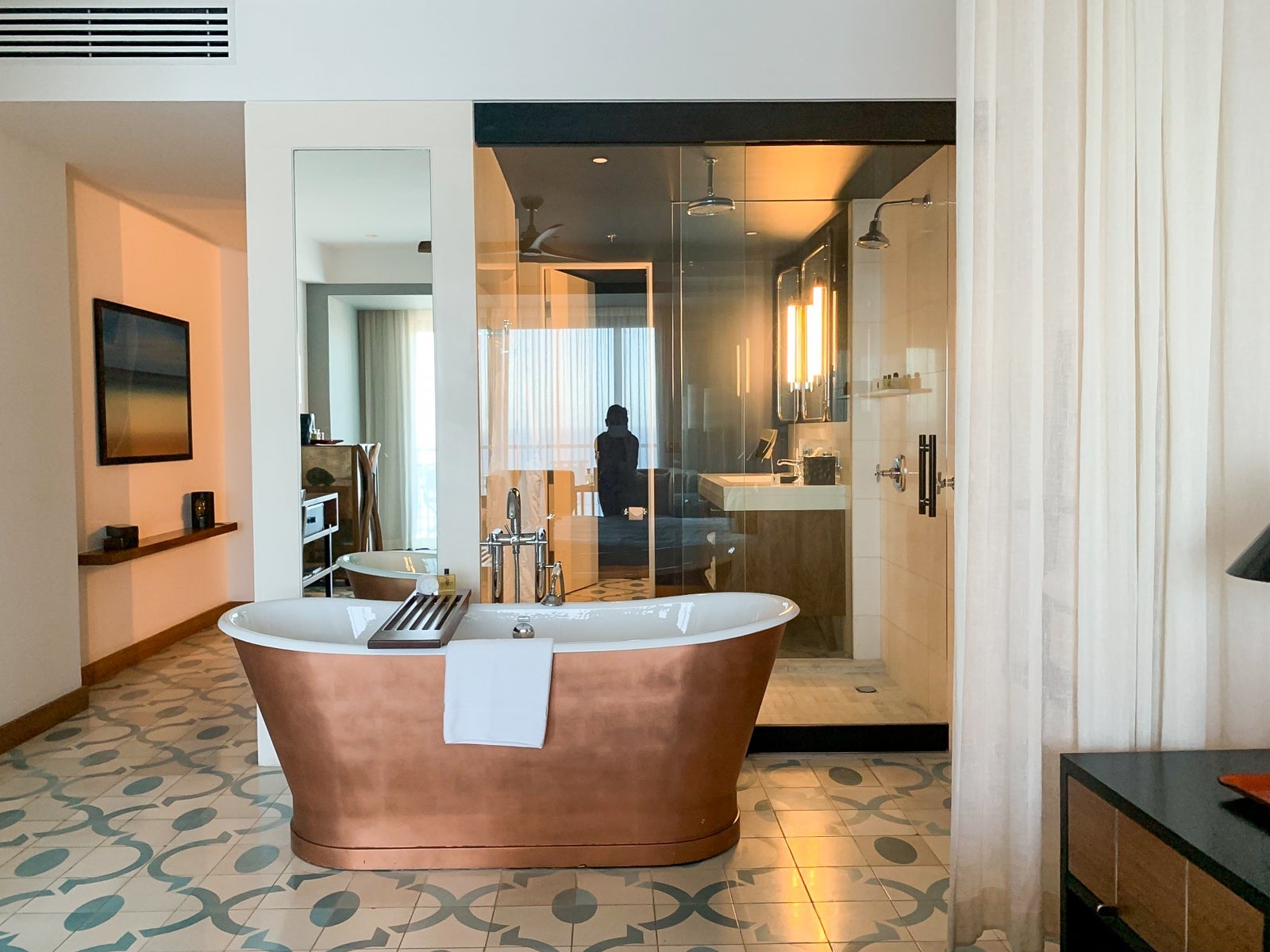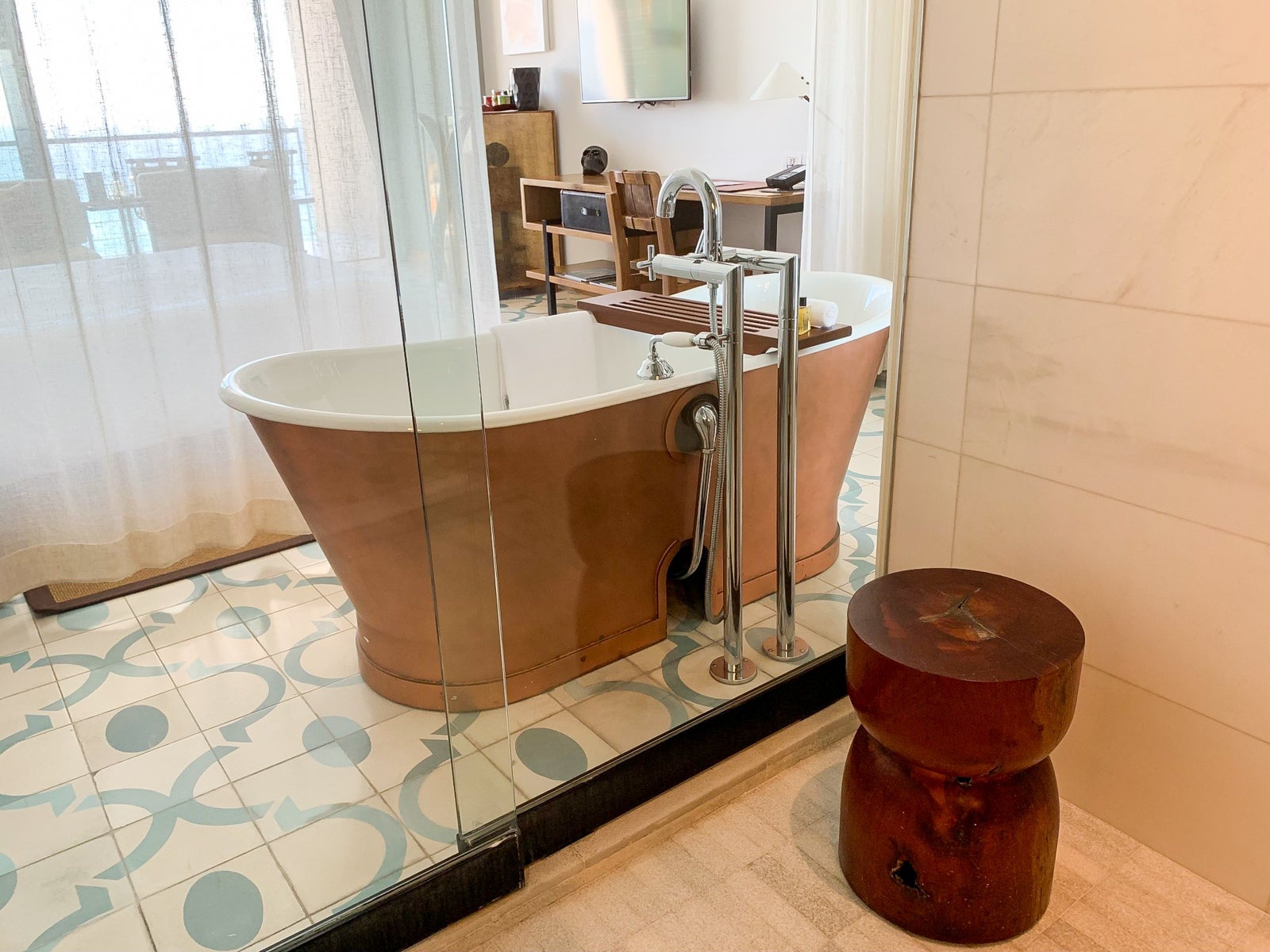 From the freestanding copper-leaf tub, I could watch television or gaze out through the wall-to-wall windows. Elegant Noken Porcelanosa monoblock taps included an oversized faucet and a handheld shower head. There was also a sliding wood bathtub tray stocked with DS & Durga Bowmaker amenities — a blend of fragrances like amber and walnut — that were also found on the bathroom vanity and in the shower.