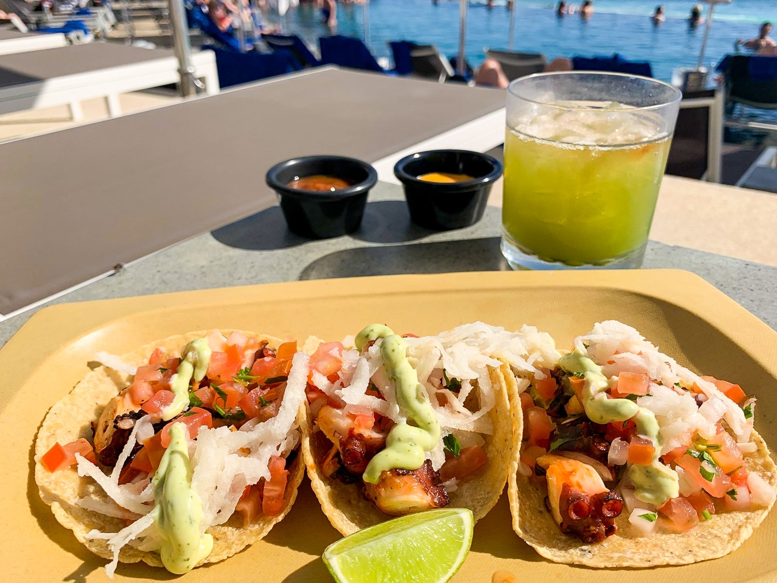 Point Break, the swim-up bar with an adjacent terrace, opened at 8am but served all-day lunch fare and snacks, including excellent charred octopus tacos with pico, coriander and jicama ($21). You can also order a blackened fish sandwich ($24), coconut-crusted shrimp ($18) and an array of ceviches and raw seafood ($12 to $38), among other plates.