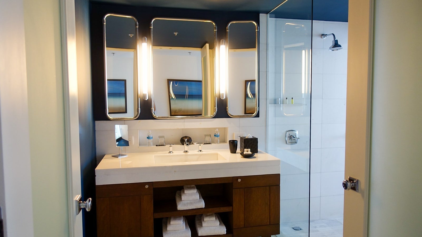 With two shower heads (both of which would pass the TPG test), an overhead rainfall shower, glass walls and a carved wood stool, the shower wasn't just a place to rinse off after a day by the pool. It was a room you could hang out in and relax for a while.