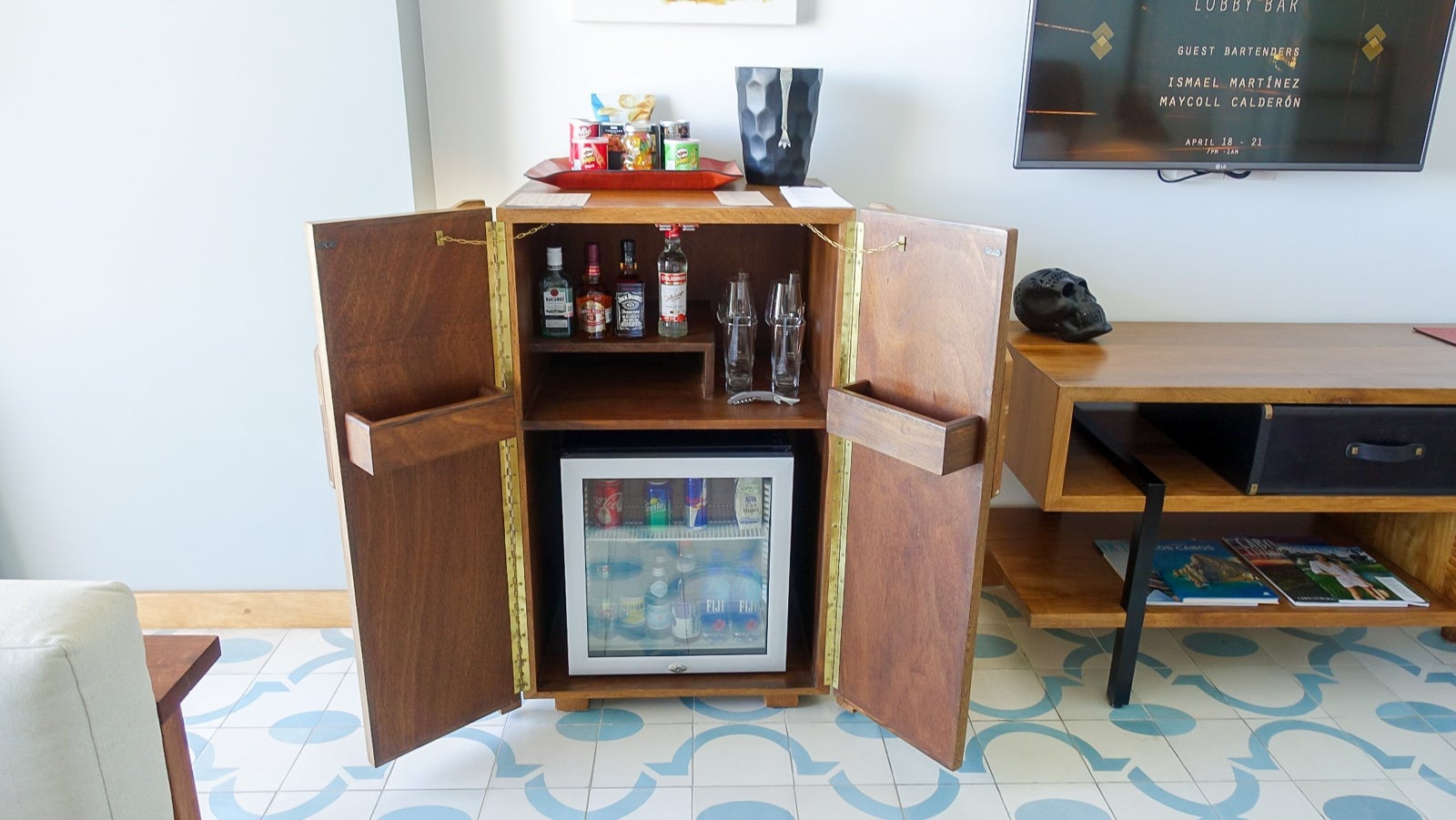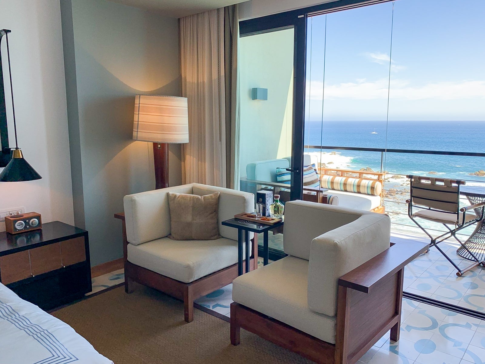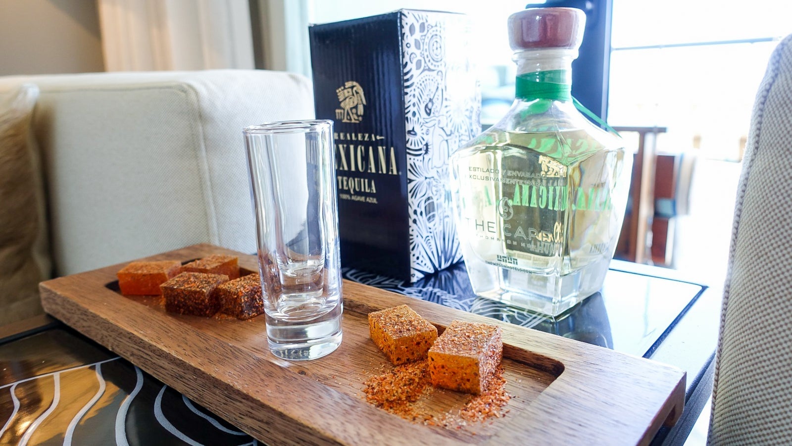The room also had a separate seating area comprising two corner chairs and a small table. When I arrived, there was a welcome tequila amenity (a full-size bottle of Realeza Mexicana tequila that I almost checked a bag for) along with tamarind and chile sweets.