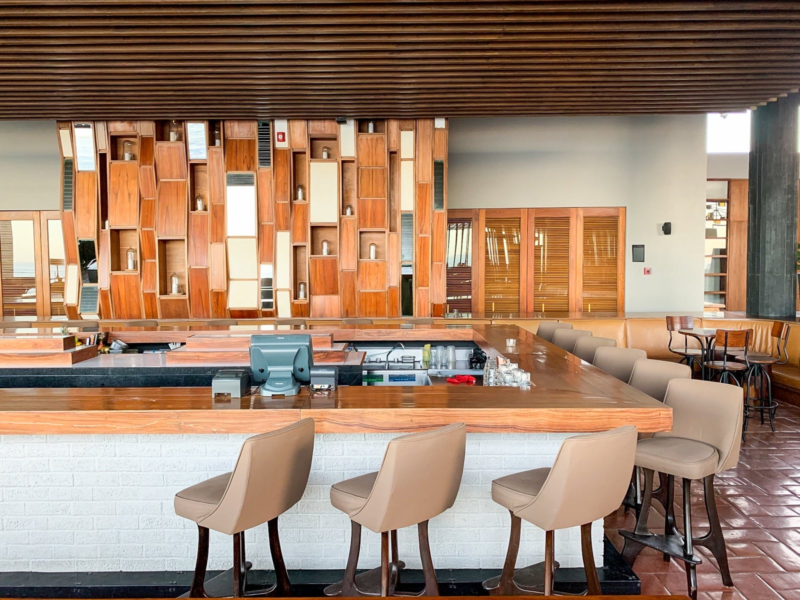 Guests could also grab drinks at the sunken Lobby Bar, which had a spacious terrace, cozy leather banquettes and wooden architectural accents.