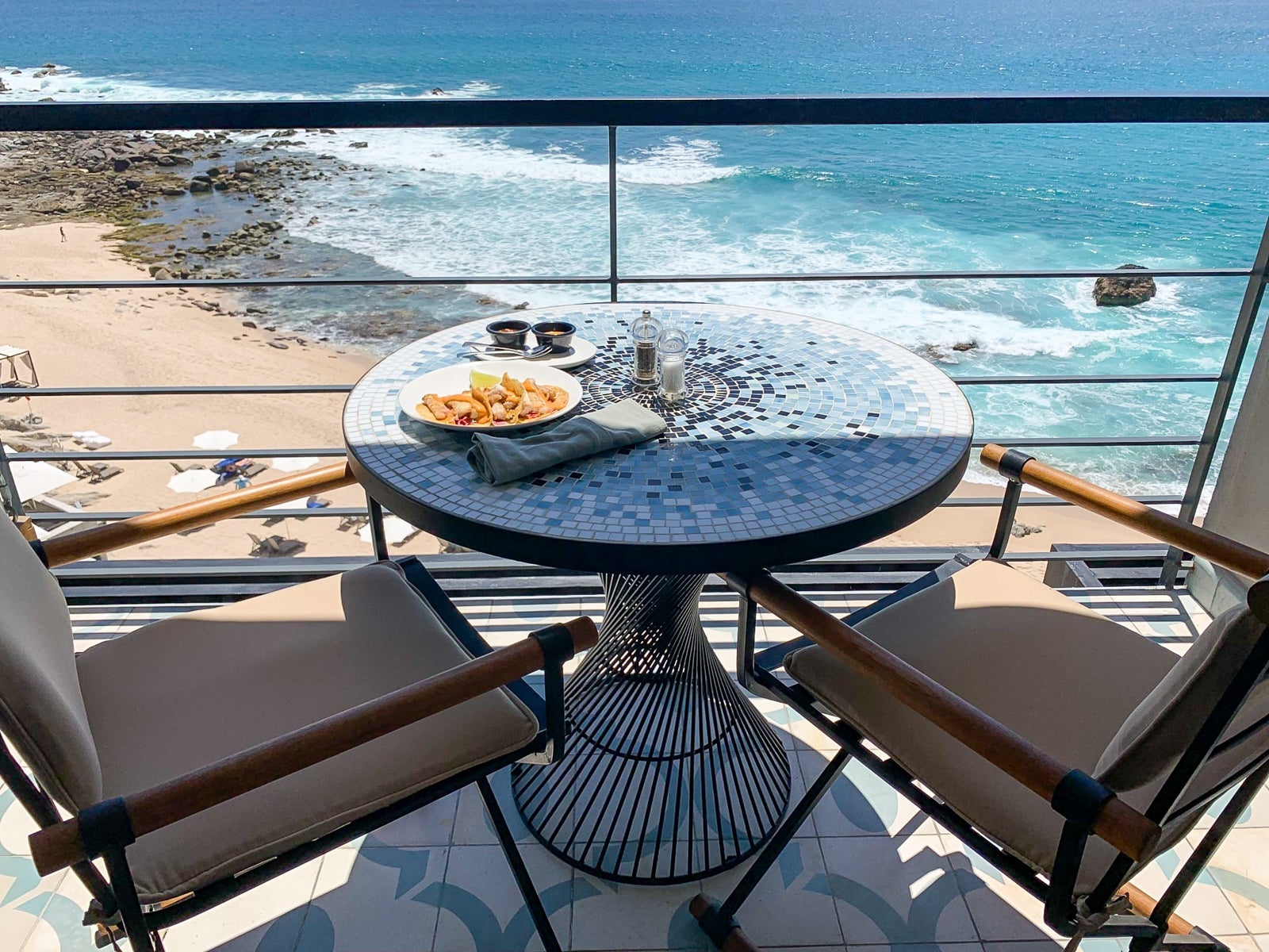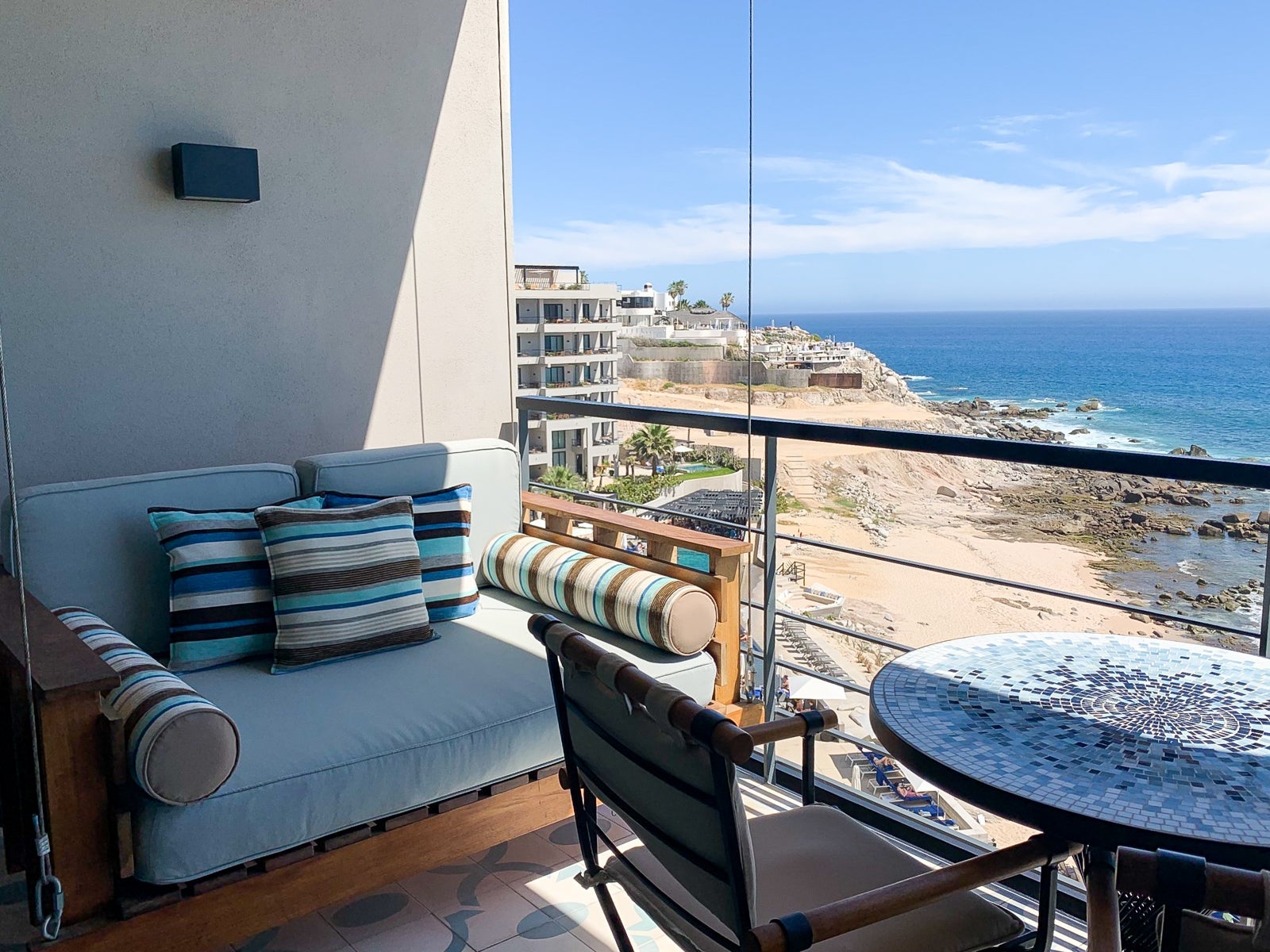The mosaic-tiled table and twin chairs were great for room-service breakfast or sunset cocktails, while the oversized, suspended daybed demanded siestas.