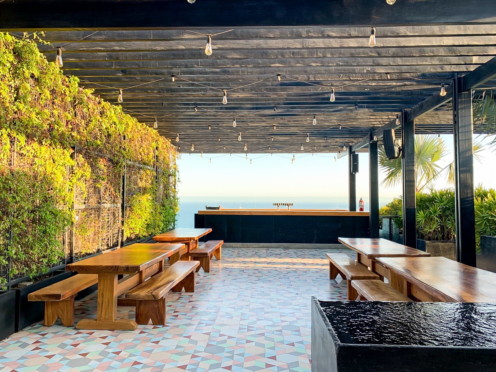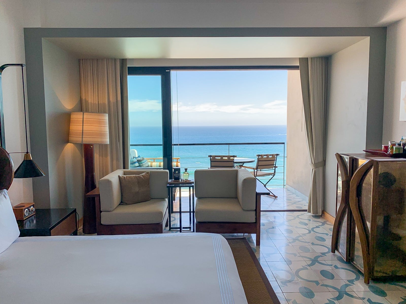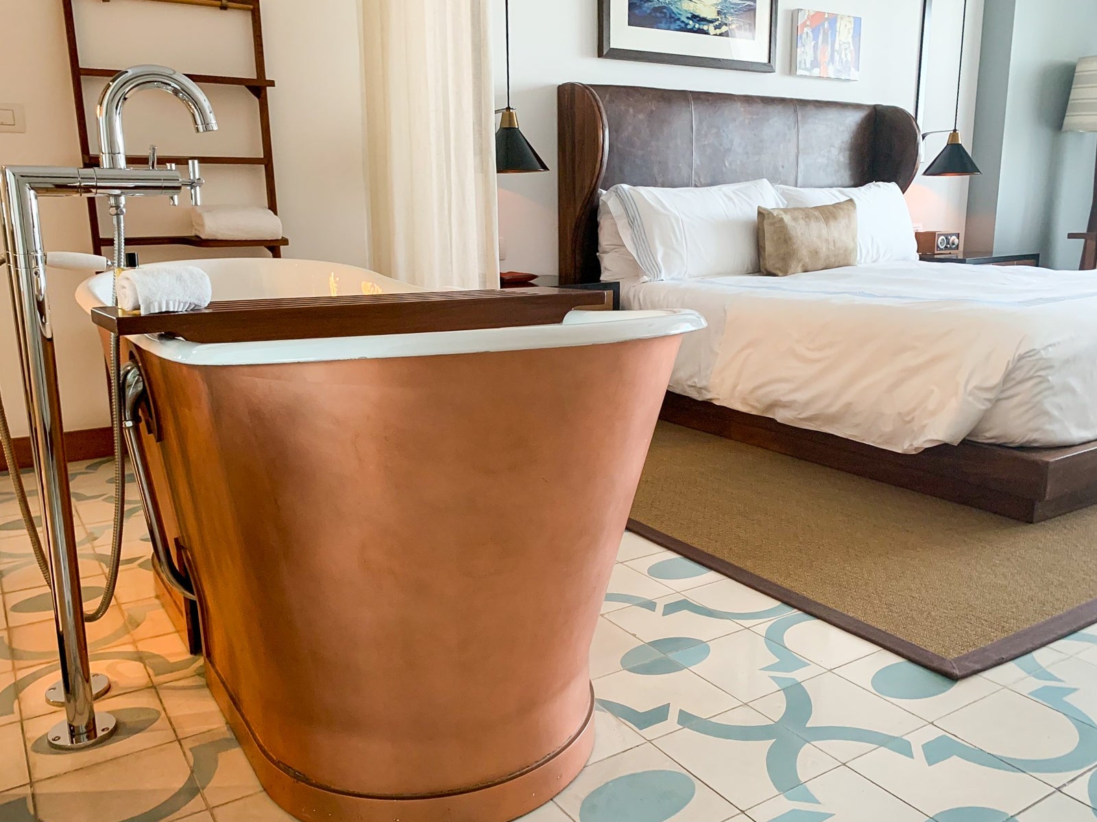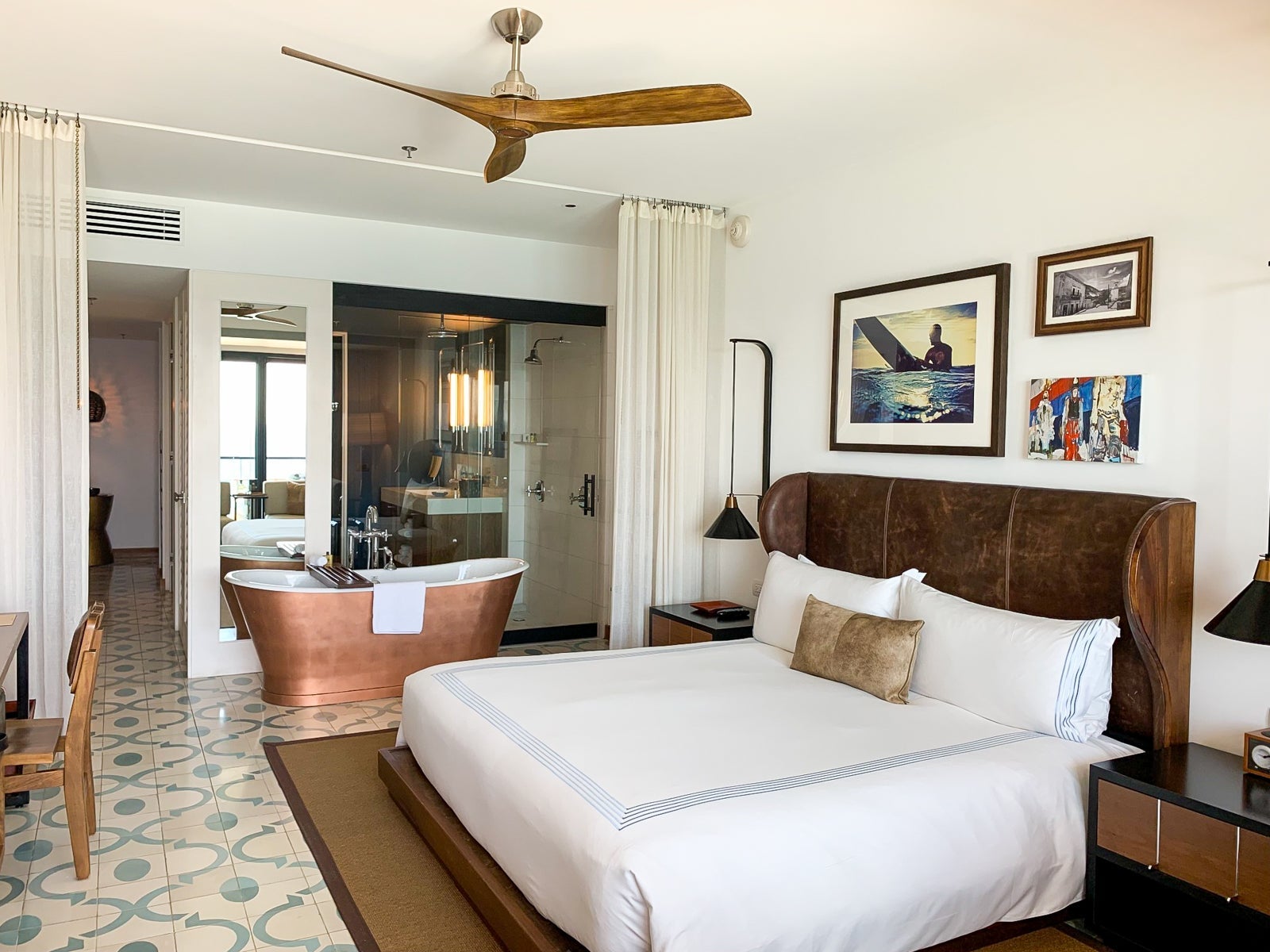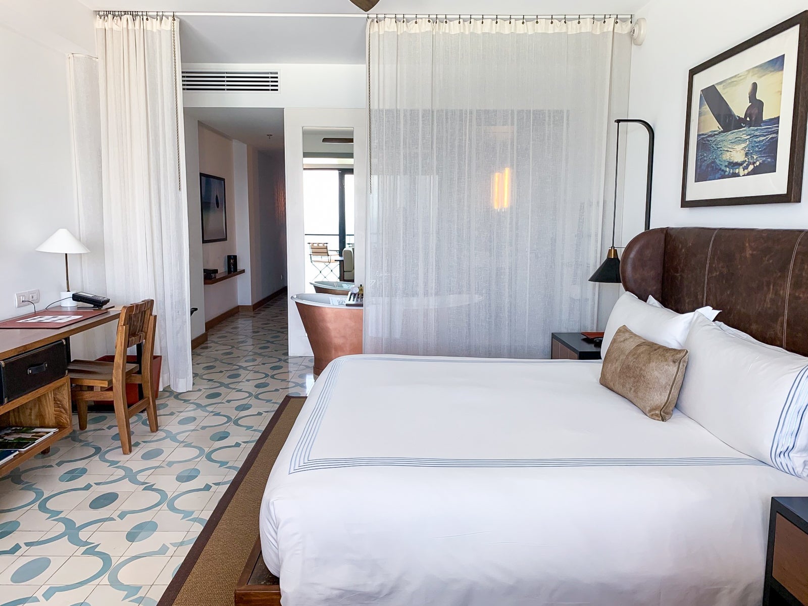 Hand-painted cement tiles (fun fact: less slippery when wet) echoed the colors of the sea, and a worn, dark leather headboard wrapped around the king bed, fitted with sateen-woven linens that kept cool in the evening.