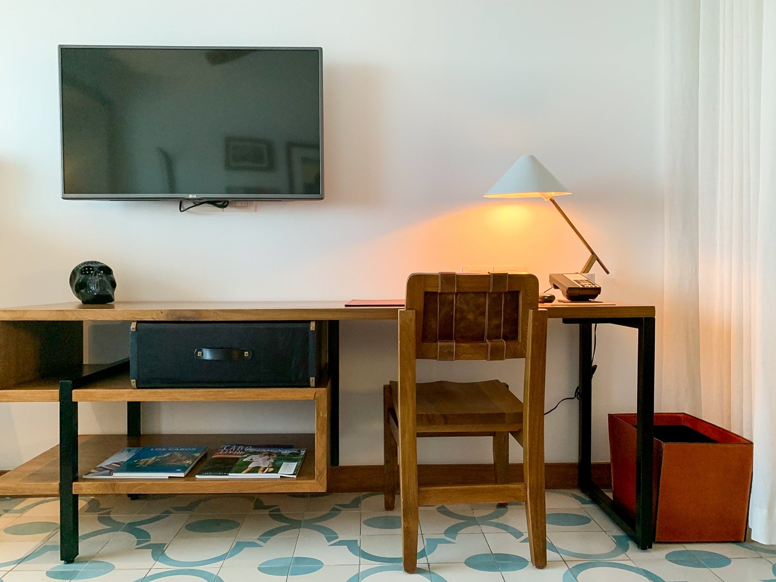 The room playfully mixed masculine elements, mid-century furnishings and sophisticated beach-club vibes — and totally eschewed any Mexican colonial kitsch.