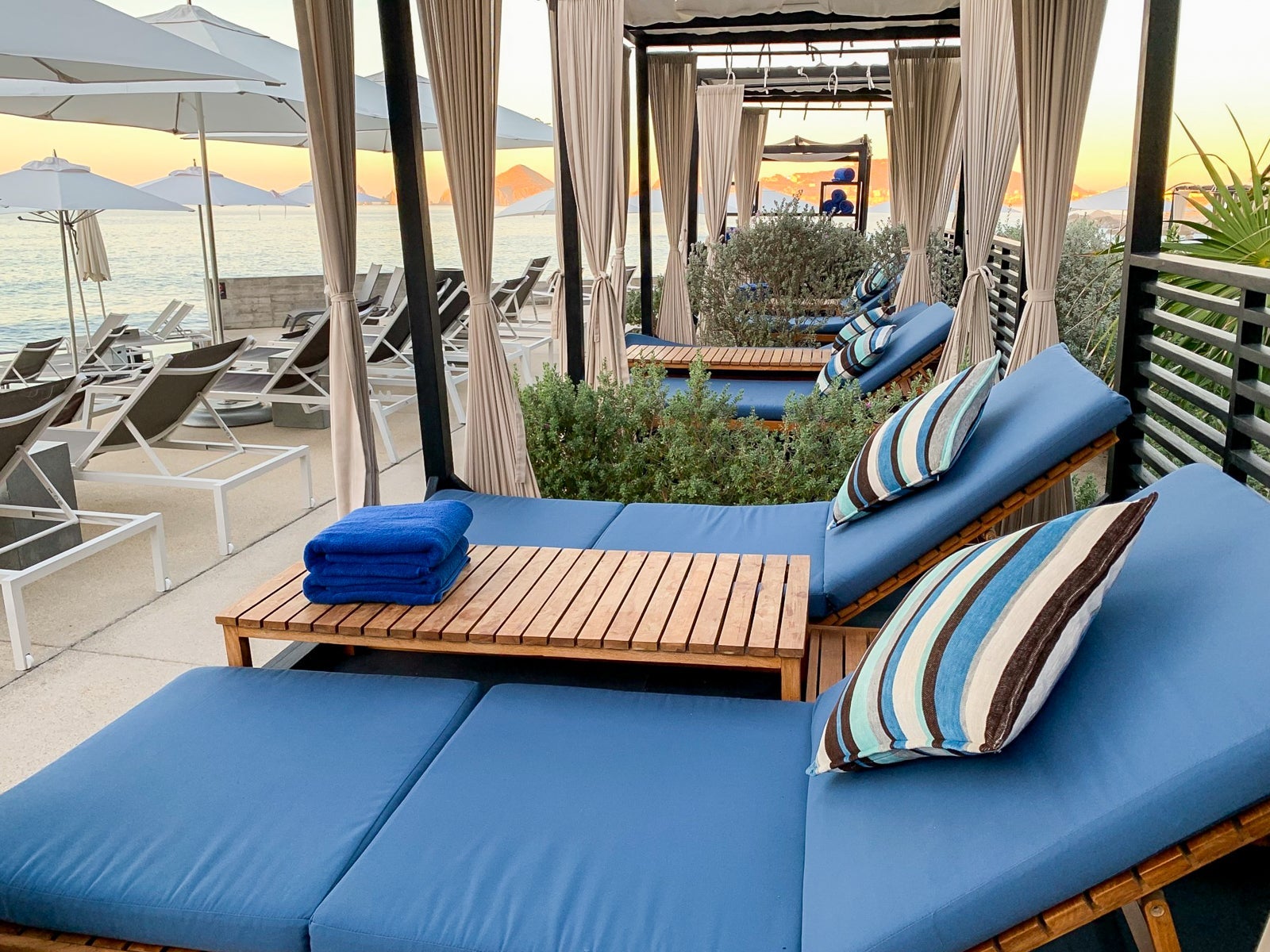 Even though that first day, the pool was crowded and the vibe was, well, rambunctious, the pool attendants were unfazed. Within minutes of claiming a chaise, an attendant offered to make up my chair — laying out the signature bright blue towel and rolling another one over the top for my head — and immediately took my order. I'd never given much thought to poolside service before, but The Cape has this down to a science.