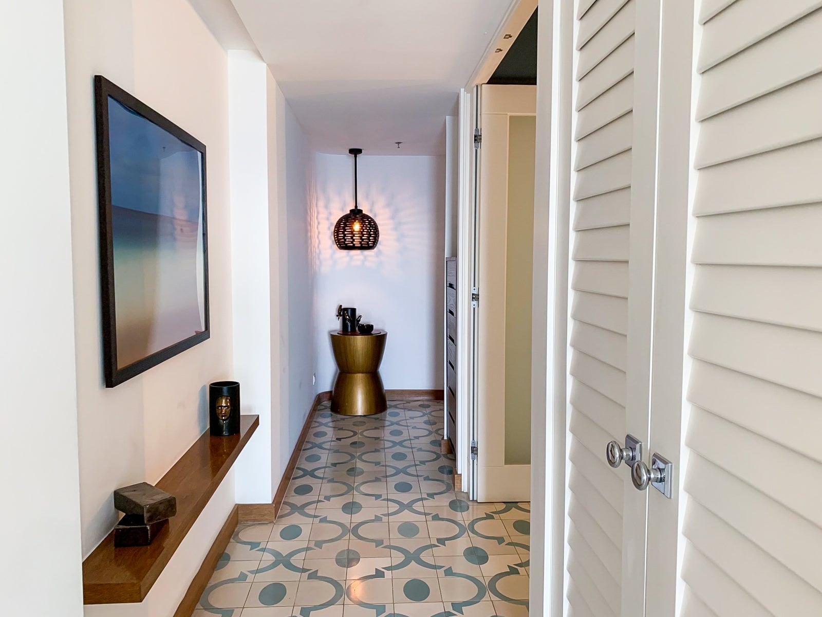 A narrow entryway opened into a light-filled, 592-square-foot room with an oversized balcony overlooking the beach.