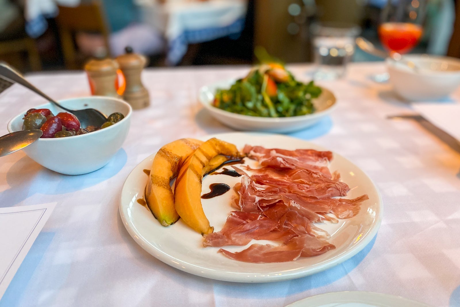 Next came our two appetizers— prosciutto and melon and the peach, arugula and mint salad, as recommended.