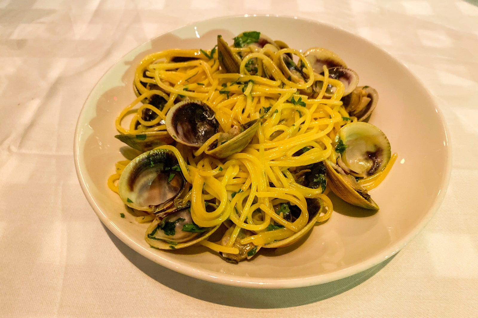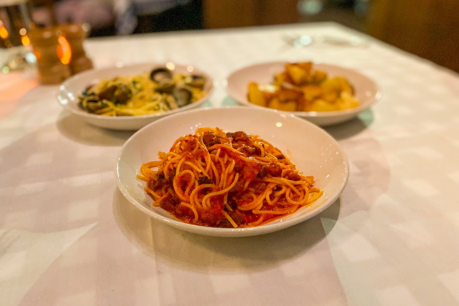 For our mains, we ordered two gluten-free pasta dishes — the pappardelle with bolognese and trenette with vongole, i.e., pasta with cockles, white wine and garlic, along with roasted Yukon gold potatoes with rosemary and garlic on the side.
