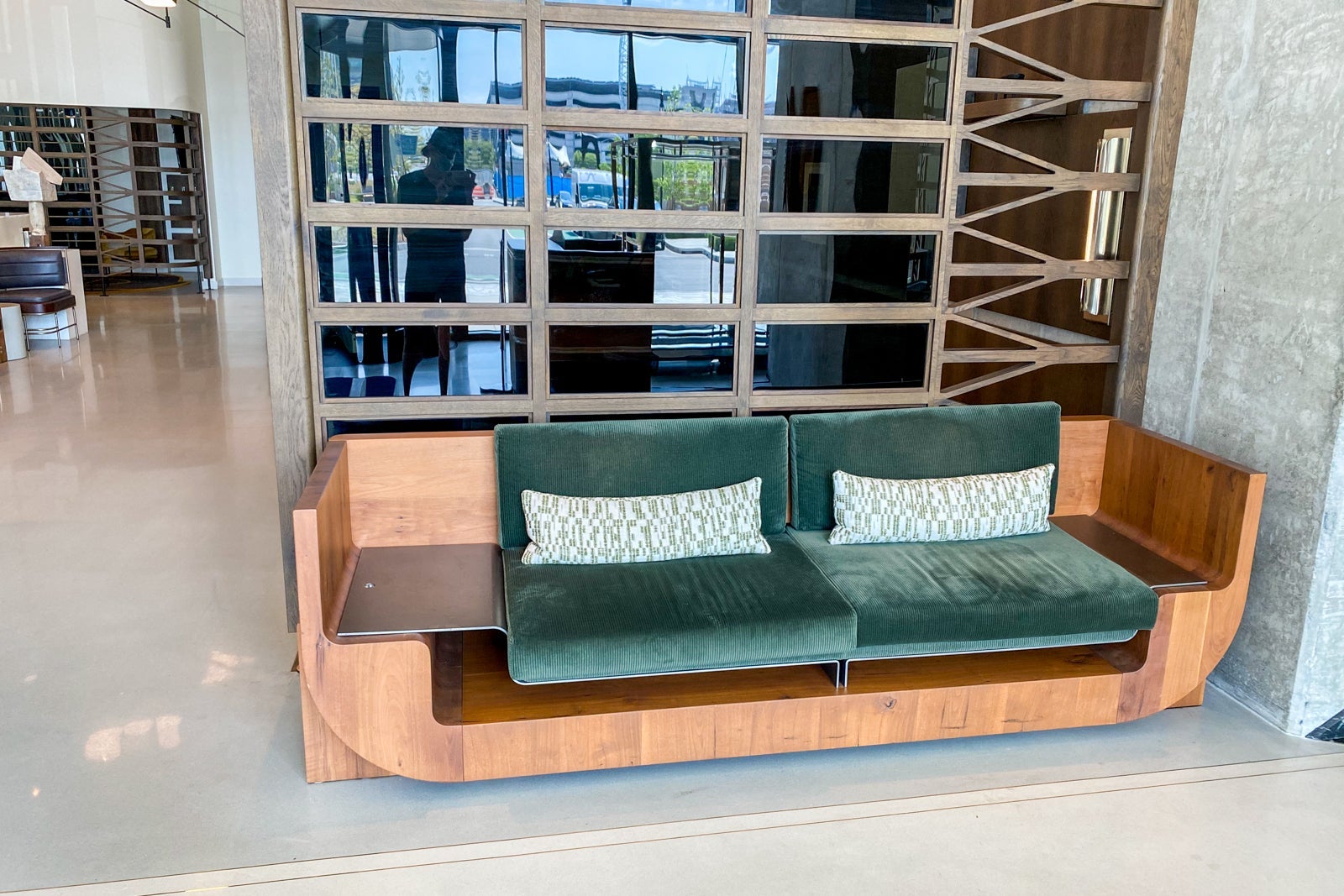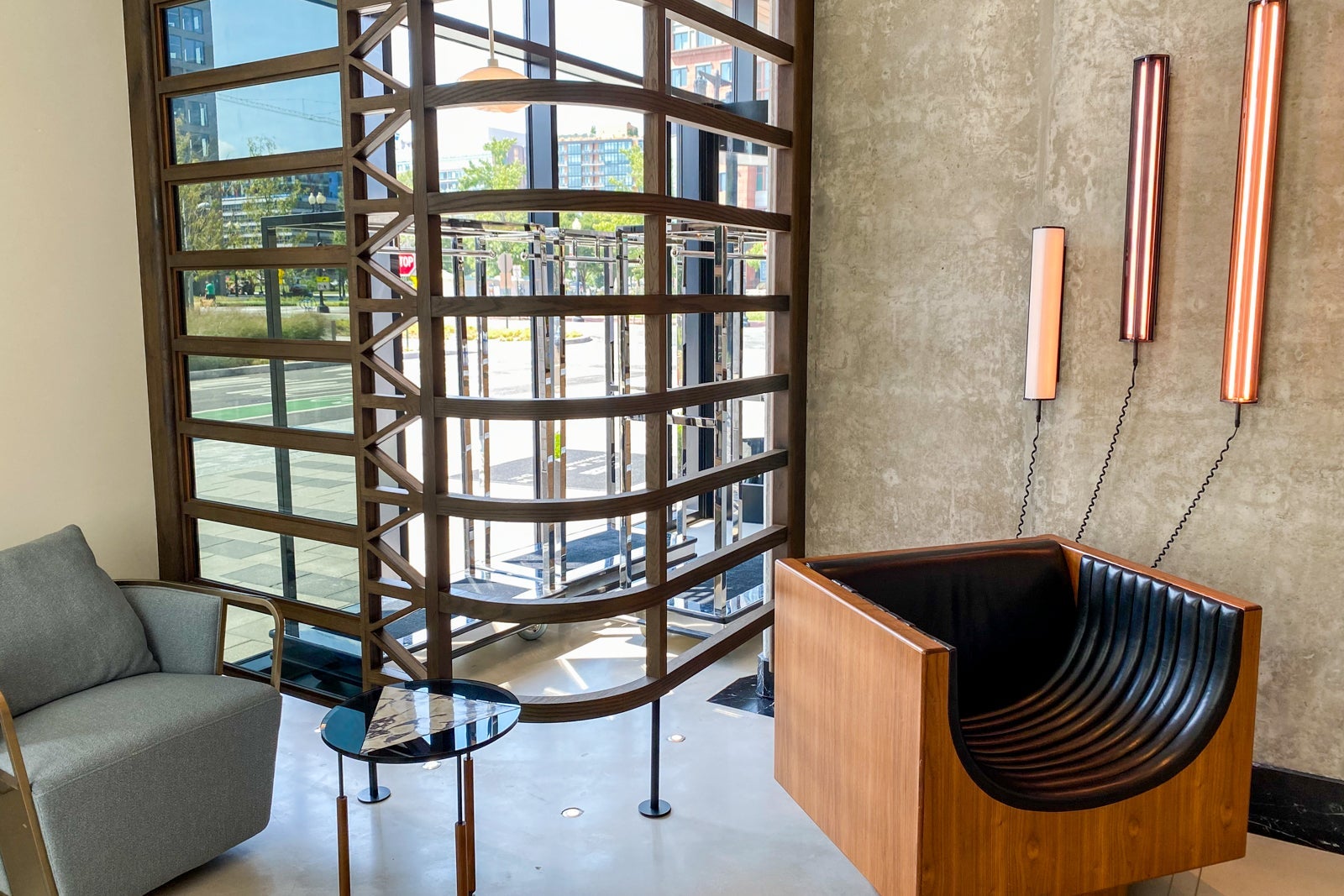 Upon walking into the lobby, I was drawn to the open concept with lots of seating areas, bright furniture and unexpected use of lines in design, specifically the light features and room dividers.