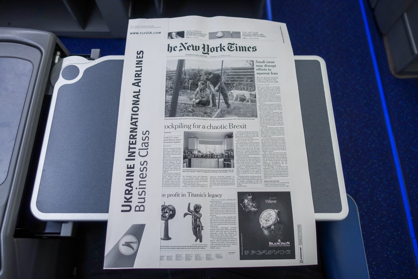 Ukrainian and English-language newspapers were offered too, although the New York Times Europe edition and Business Traveler were the only publications in English. The Times had a customized spine, a classy touch and something I had never seen before.