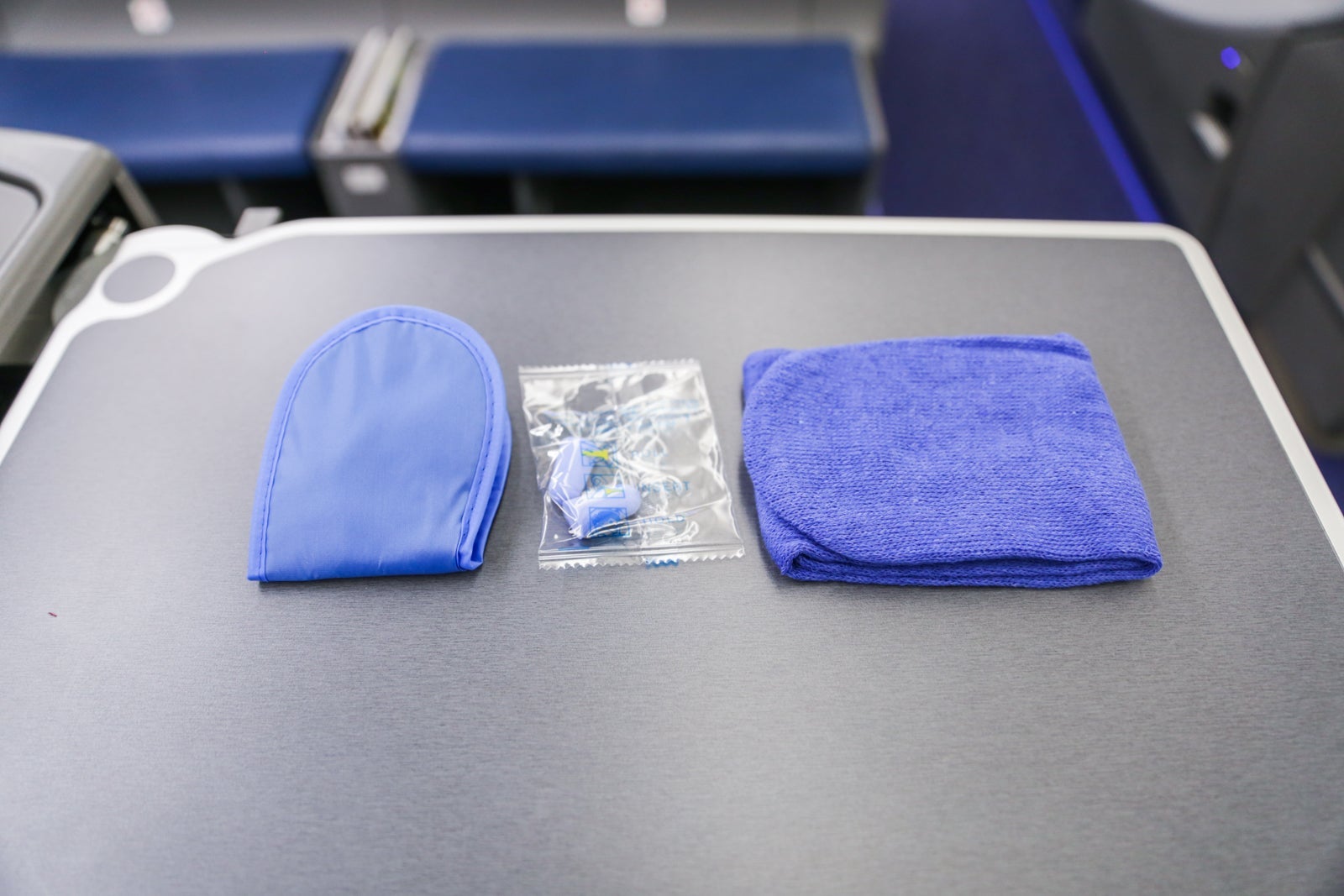 The amenity kit was a bit of a joke, and looked like something you'd find in premium economy or even economy on a Middle Eastern carrier. Inside was an eye mask, earplugs and a pair of thin socks. Apparently, I received a pared-down version, because UIA's website said its kits are supposed to contain a toothbrush and toothpaste too.
