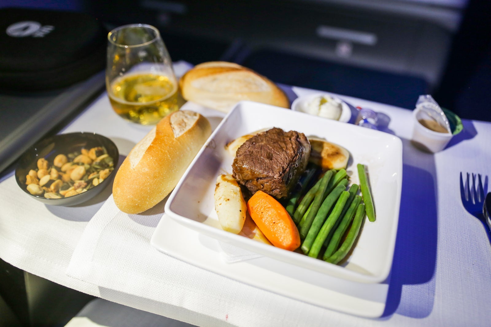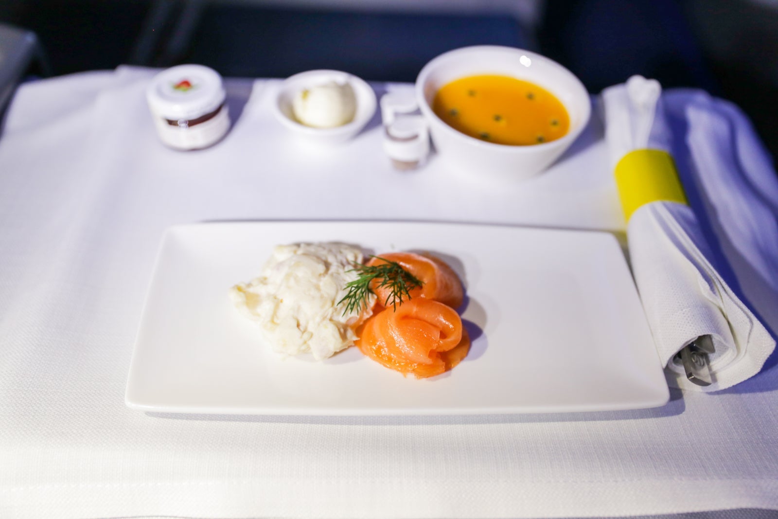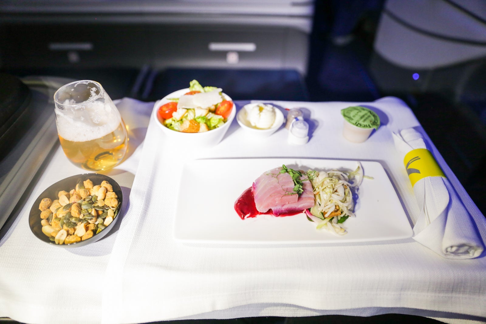 The first thing I noticed about the meal service was that no menus were provided — quite unusual for an international business-class flight. The flight attendant didn't have a real answer about the lack of menus. I wasn't able to peruse the list of drinks or read what each dish was dressed with, and this could be dangerous for someone with food allergies.