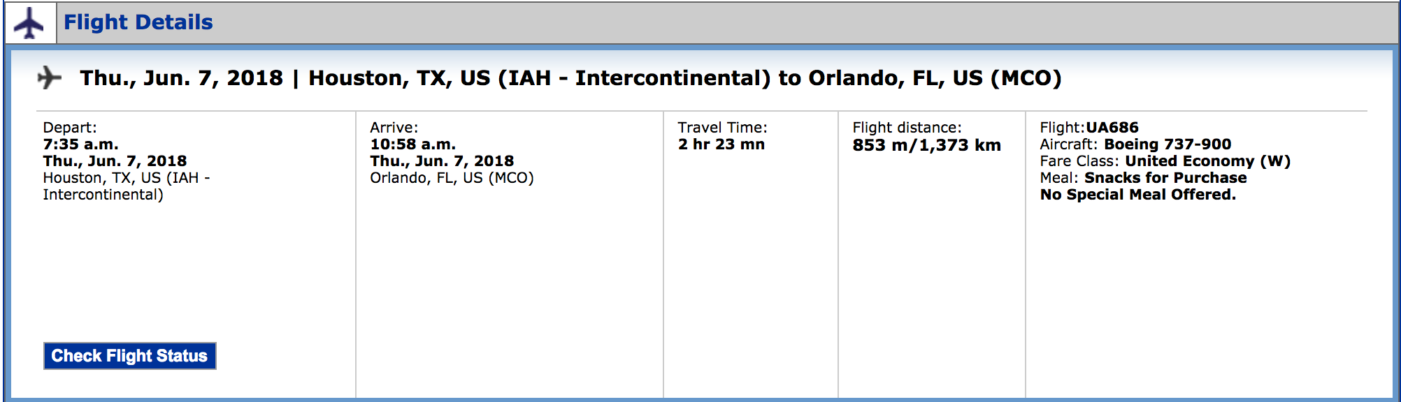 Back in February, United shared its initial list of 737 MAX 9 flights, with the first flight scheduled to take off on June 7. I immediately booked a seat on the very first flight, from Houston (IAH) to Orlando (MCO), with the outbound in economy and the return in first class, so I could review both cabins. The round-trip mixed-cabin itinerary cost $490. We used the Platinum Card from American Express to purchase this flight, which yielded a total of 2,450 Membership Rewards points — equivalent to about $47 according to TPG's latest valuations.