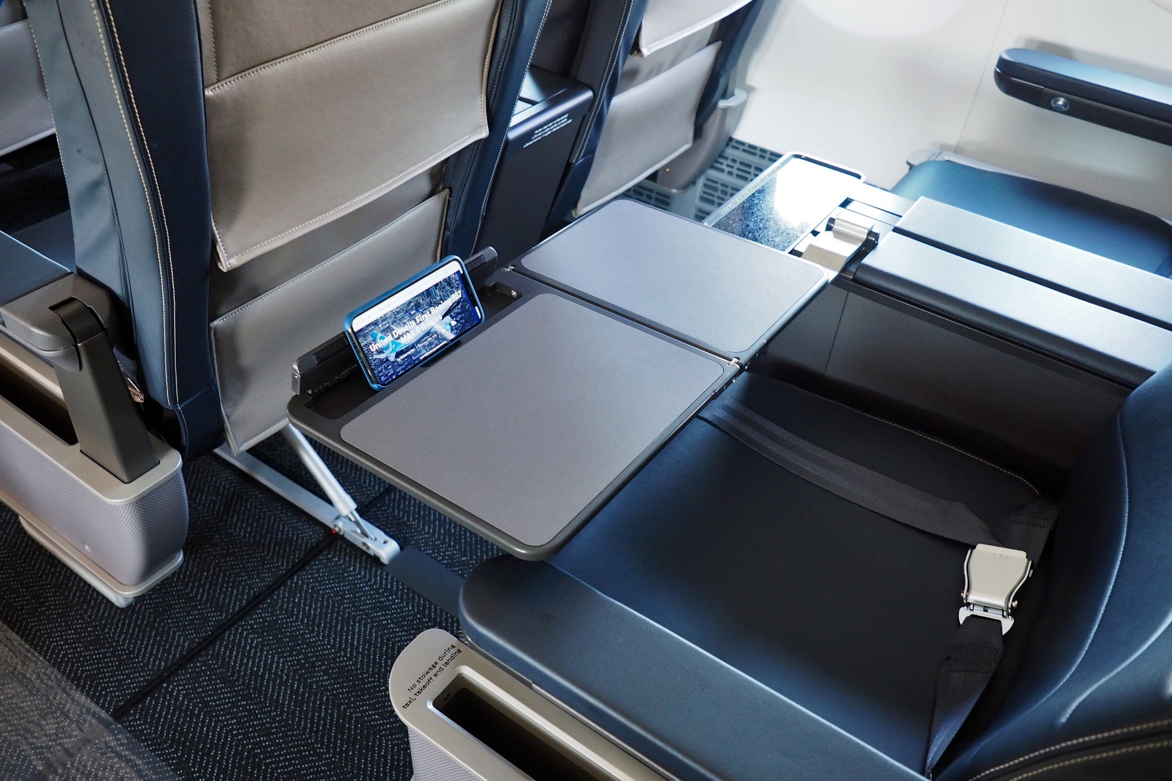 Instead of a tablet holder in the tray table, economy seats offer a pop-down platform at the back of each seat — the same model installed in AA's new fleet.
