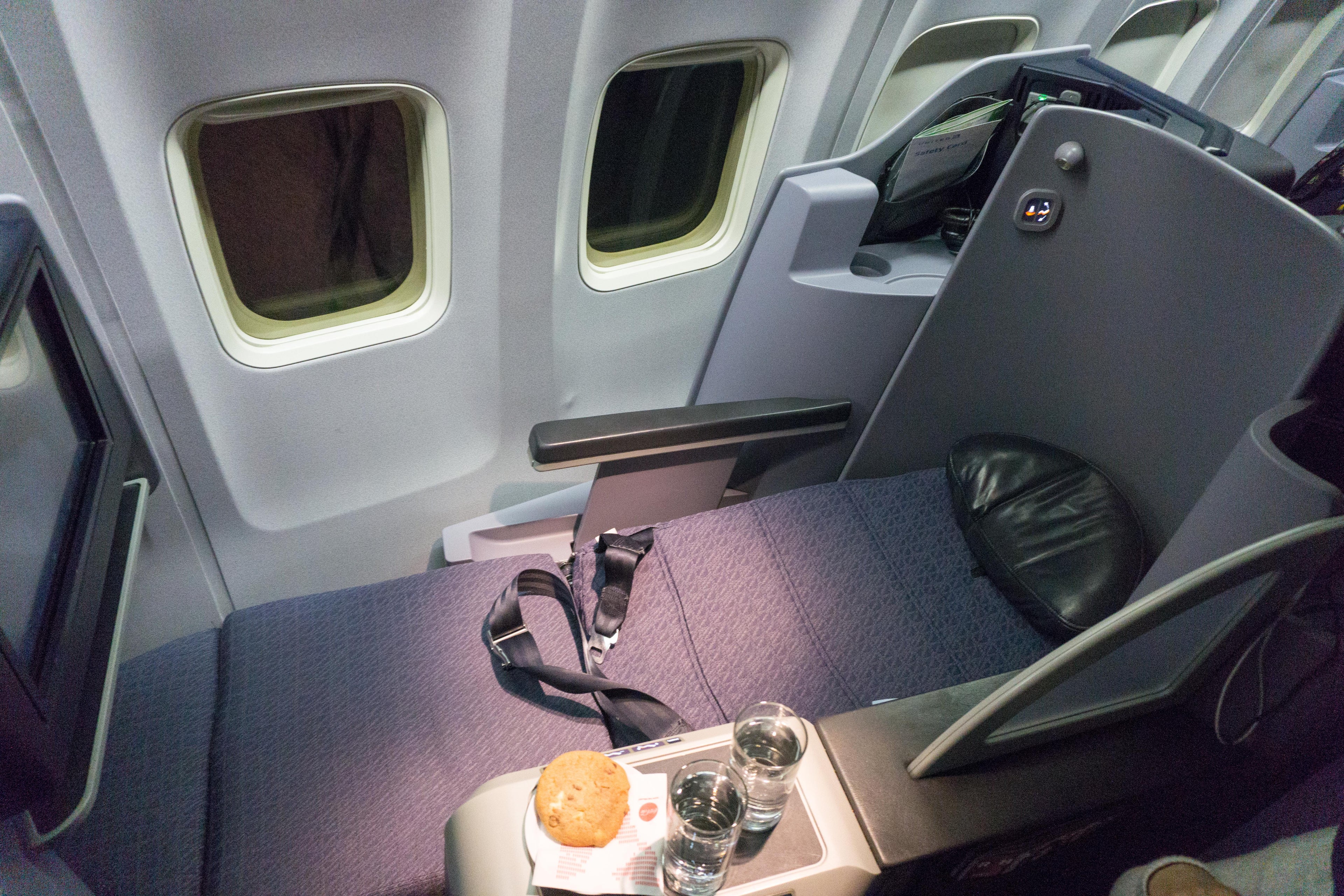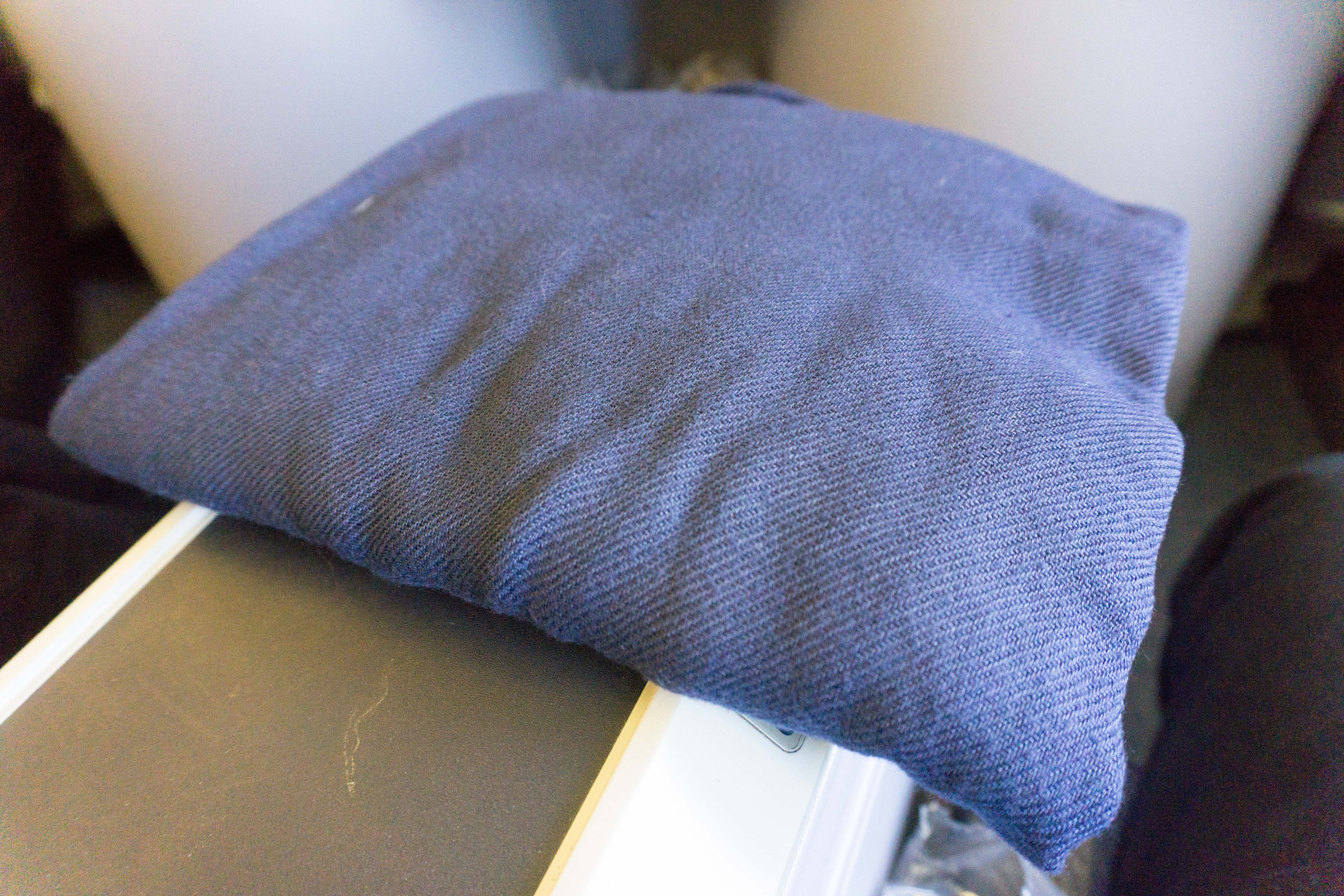 The foot cubby was tight and got very cold during the flight, but overall the seat was comfortable in lie-flat mode. The provided blanket, though, barely qualified as one — it was very thin, and very scratchy. I ended up wearing my coat to keep warm.