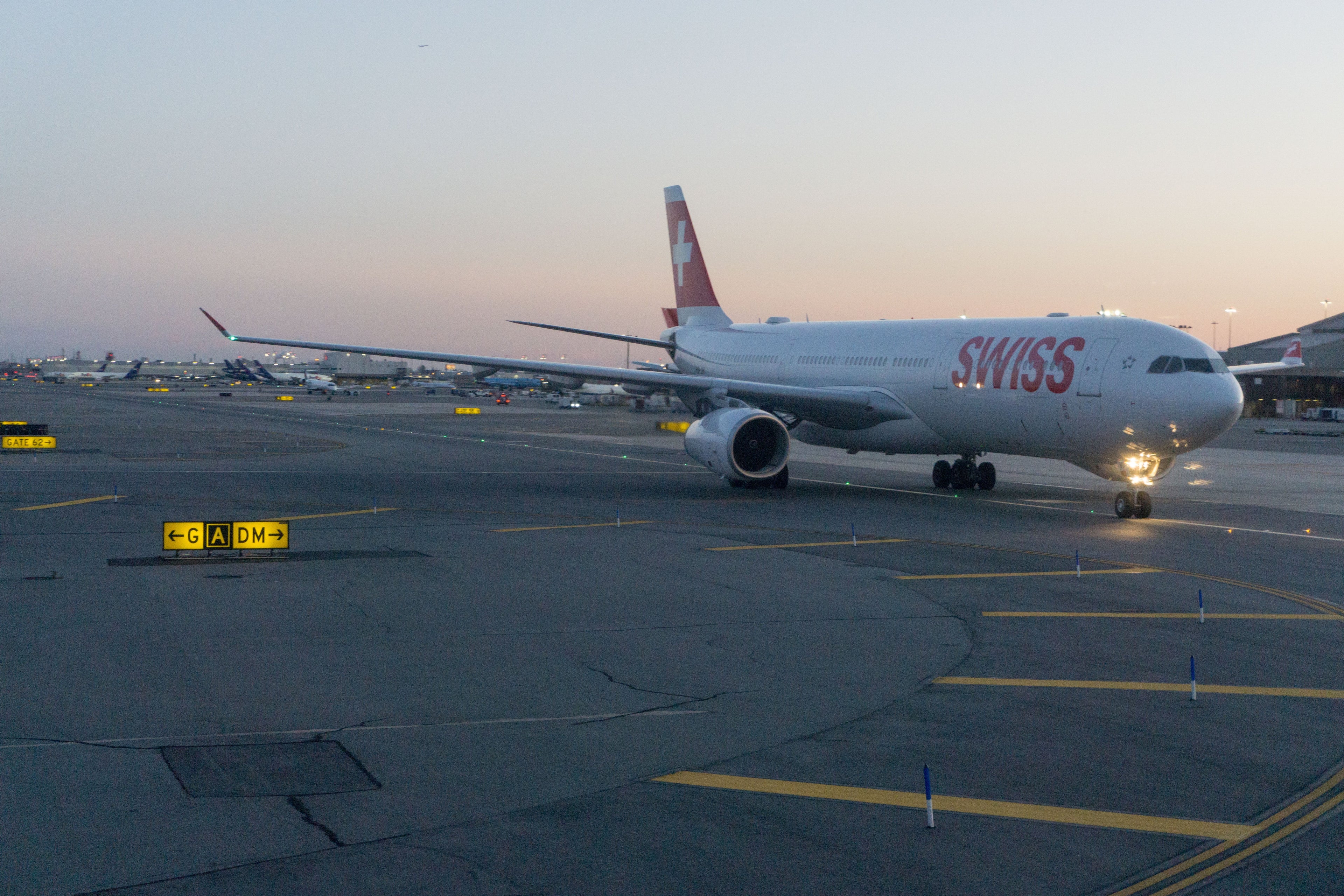 In the end, our delay was about an hour and 15 minutes. On our taxi to the runway, I caught glimpse of Swiss' A330 at dusk, which had just arrived from Zurich (ZRH).