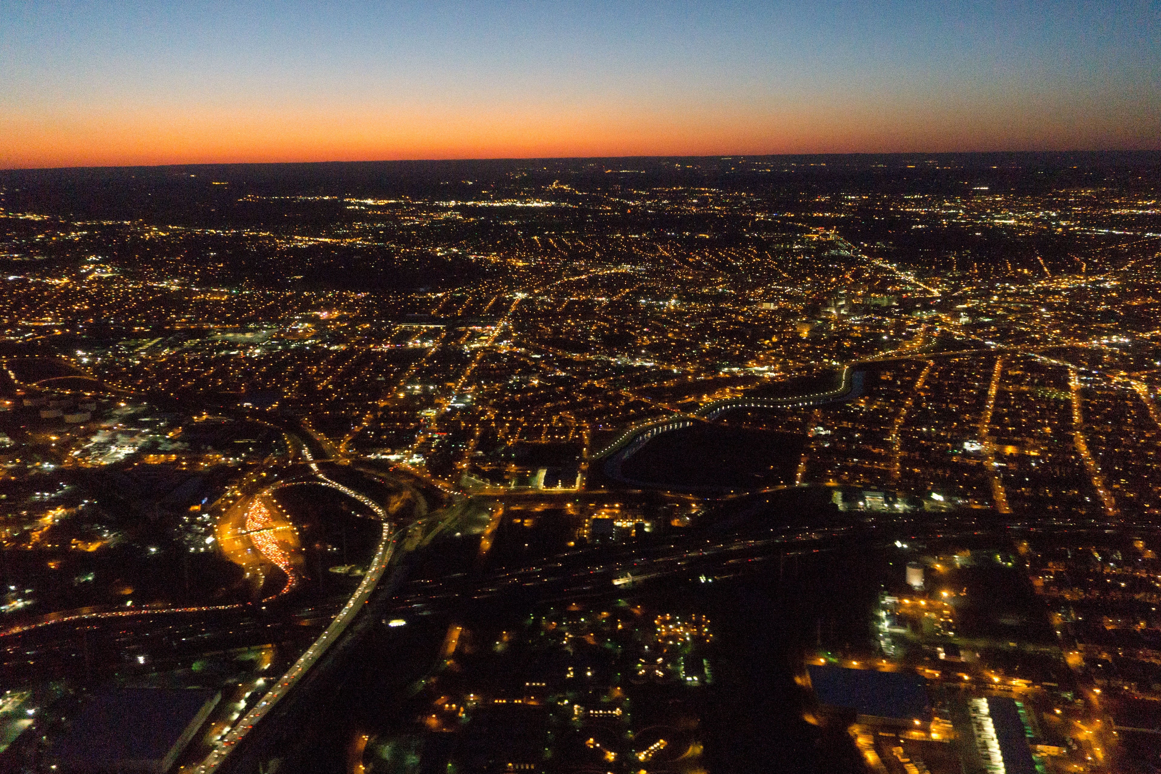 It was rush hour on the taxiway — there were 15 planes ahead of us waiting to take off. Once we got airborne, though, there was a beautiful sunset over New Jersey.