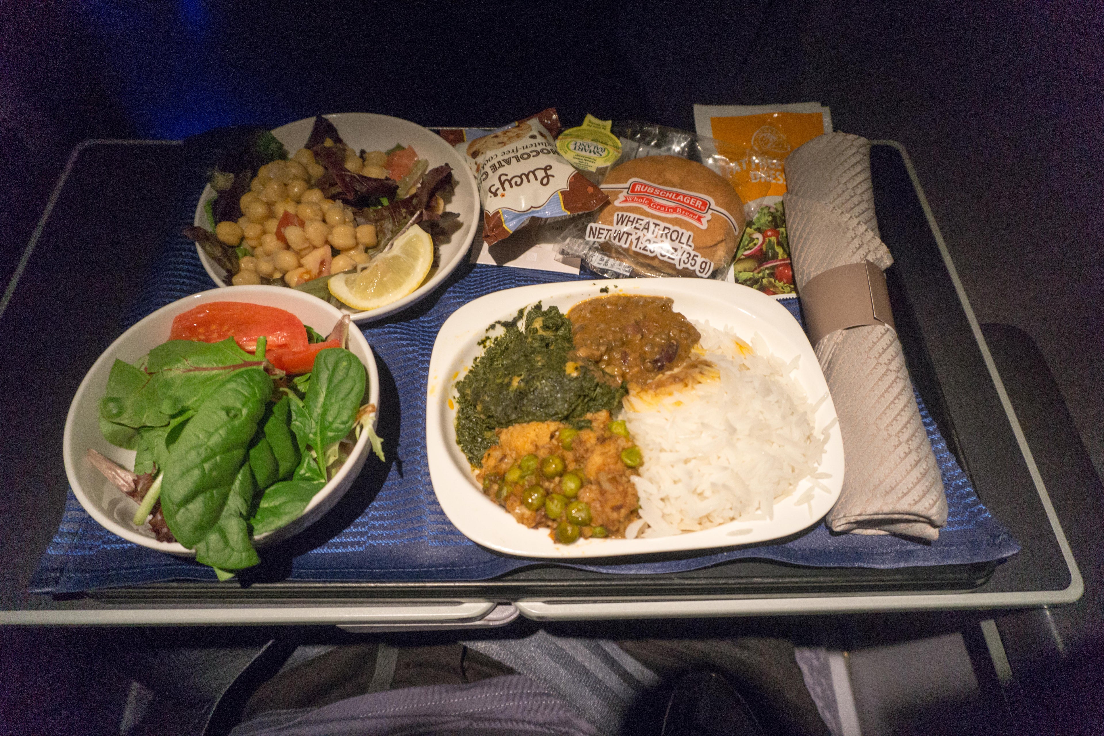 As pescatarians, we were excited to see an all-vegetarian menu, though I could hear some passengers complaining about the lack of a meat-based option. I had pre-ordered a special Hindu meal, since United hadn't previously offered special meals on any first-class domestic flights. I thoroughly enjoyed the three veggie curries and rice, which were spicy and wholesome, though the chickpea salad was bland. I washed it all down with a cabernet sauvignon and merlot blend, which was smooth and drinkable.