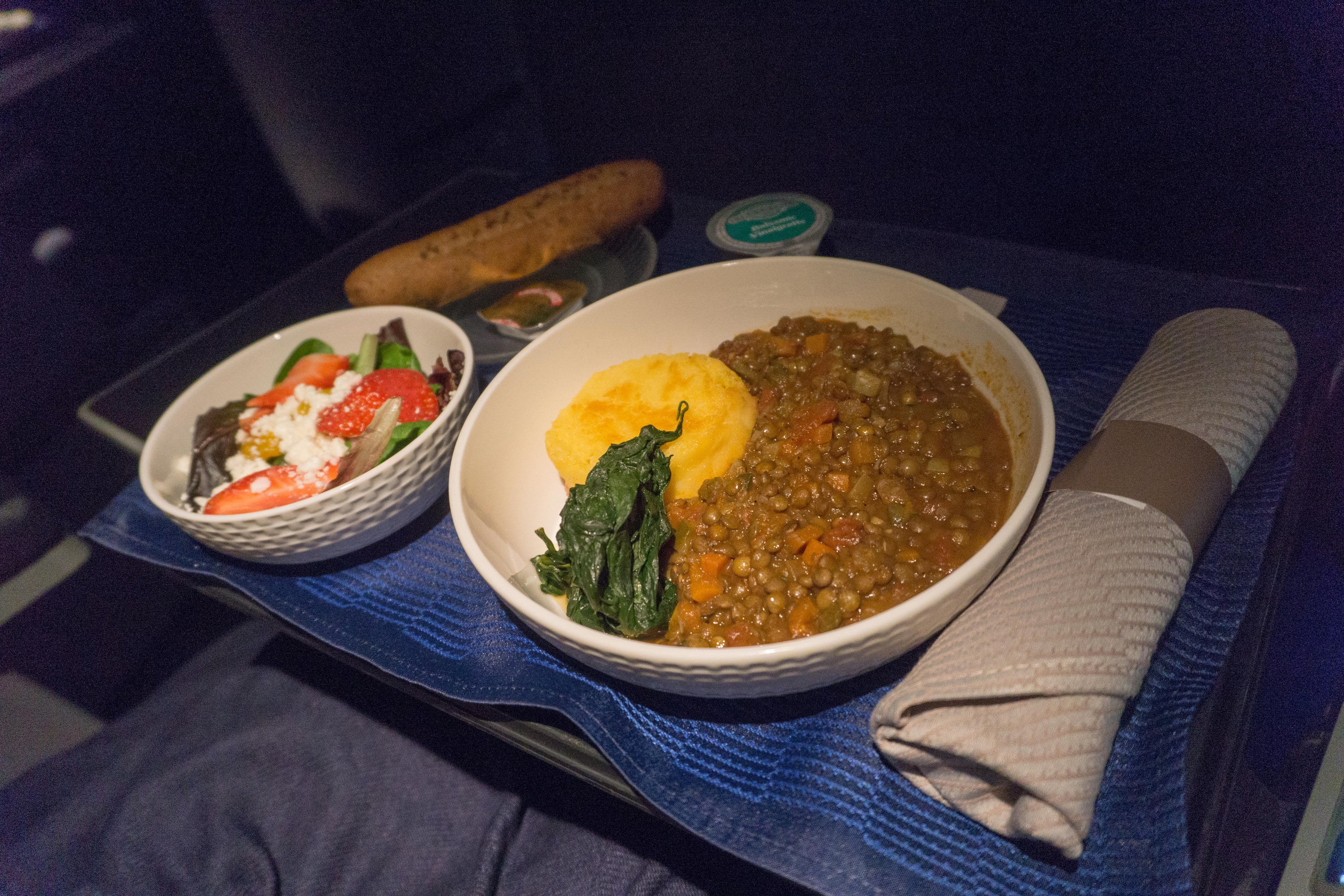 My fiancée went with the lentils, which were surprisingly flavorful.It was served with a small salad that had strawberries and feta. The funny thing about this meal, though, was the same thing was served on a Polaris transatlantic flight I was on recently, only with a piece of salmon on top.