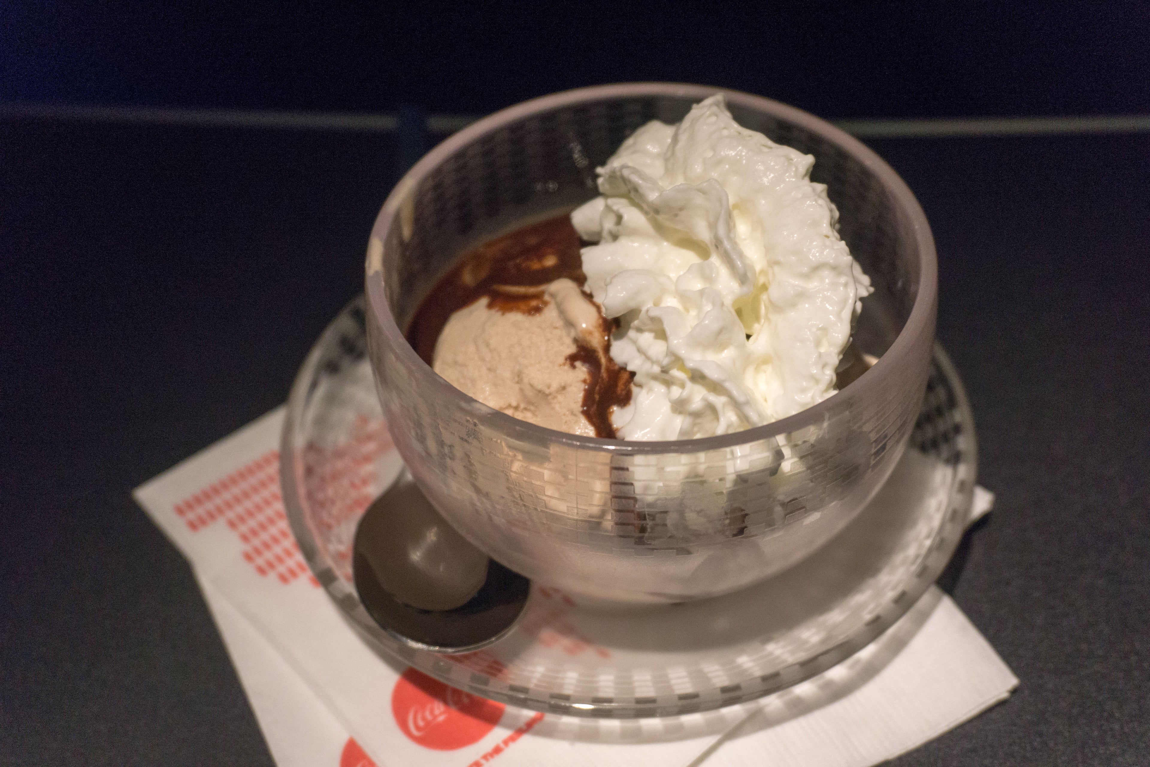 For dessert, there were ice cream sundaes (note that it was served in a new plastic bowl), which I couldn't pass up. However, I was kind of disappointed — the ice cream tasted overly sweet and grainy to me. It was definitely not as good as what the airline serves on major international routes.