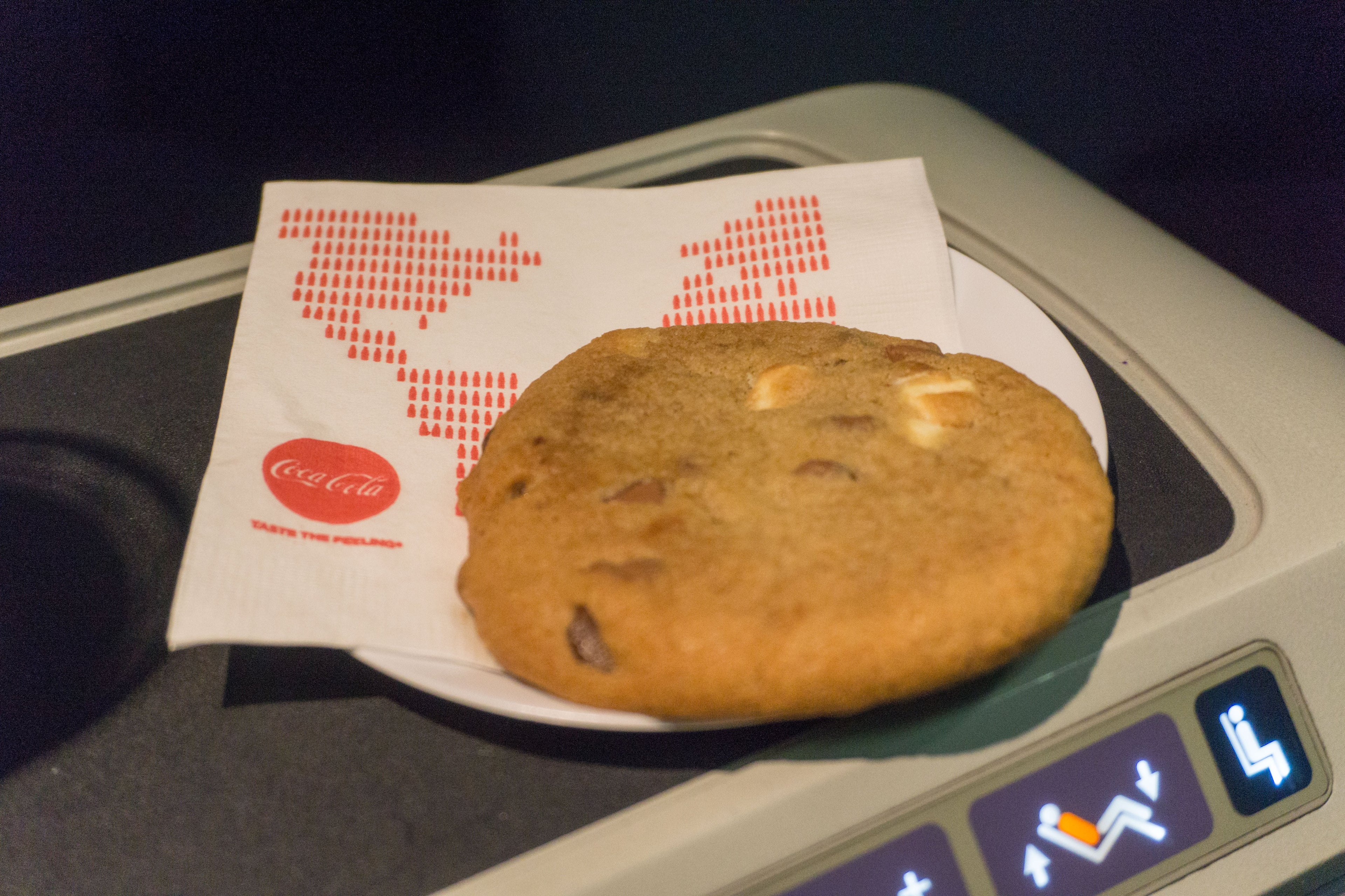 About 20 minutes before we made our descent into Seattle, the FAs came around with warm chocolate-chip-and-marshmallow cookies, which were buttery and melted in our mouths. My fiancée claimed these were some of the best cookies she's ever had, and when she mentioned it to the FA, she was generously offered a second one (which she turned down with regret).