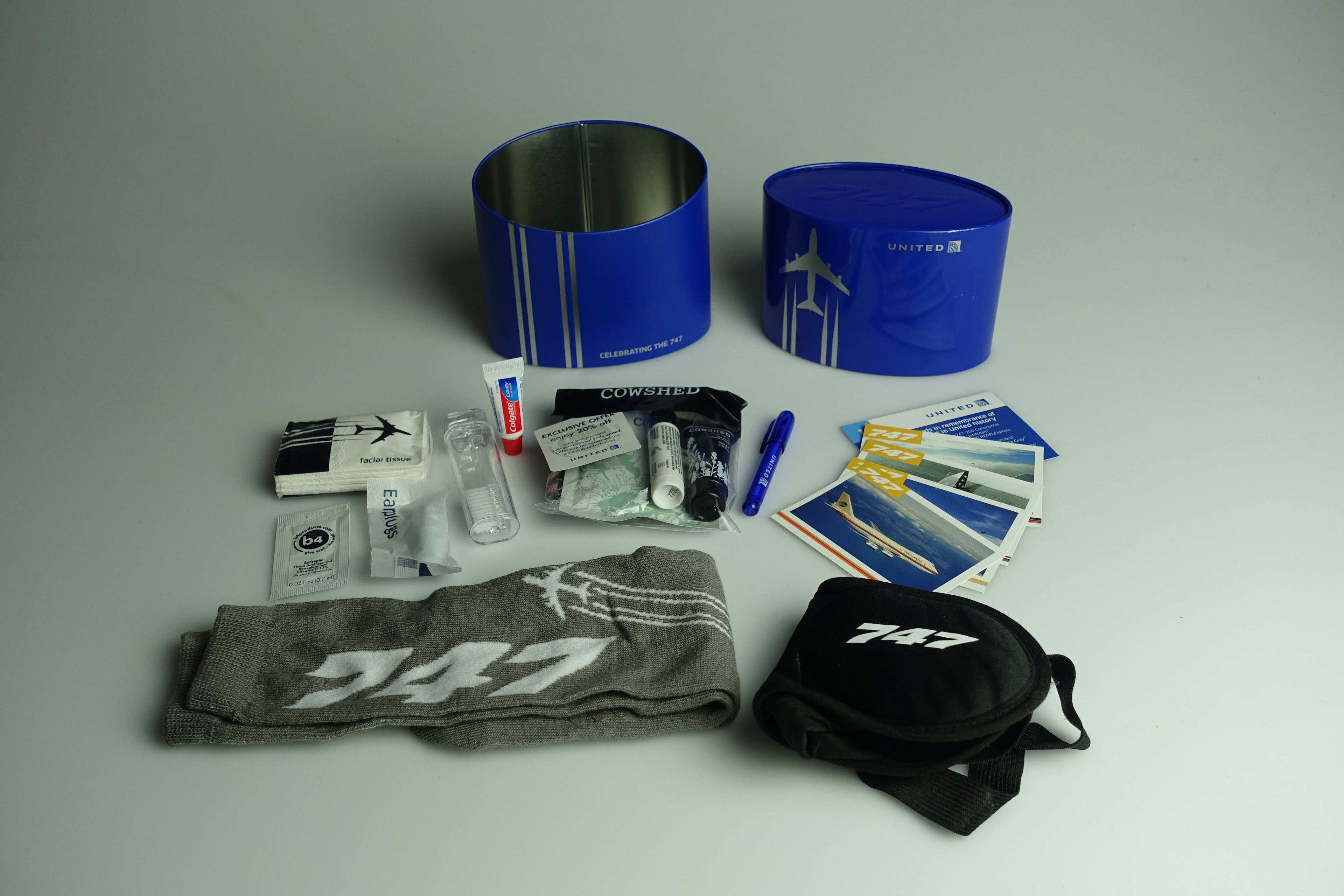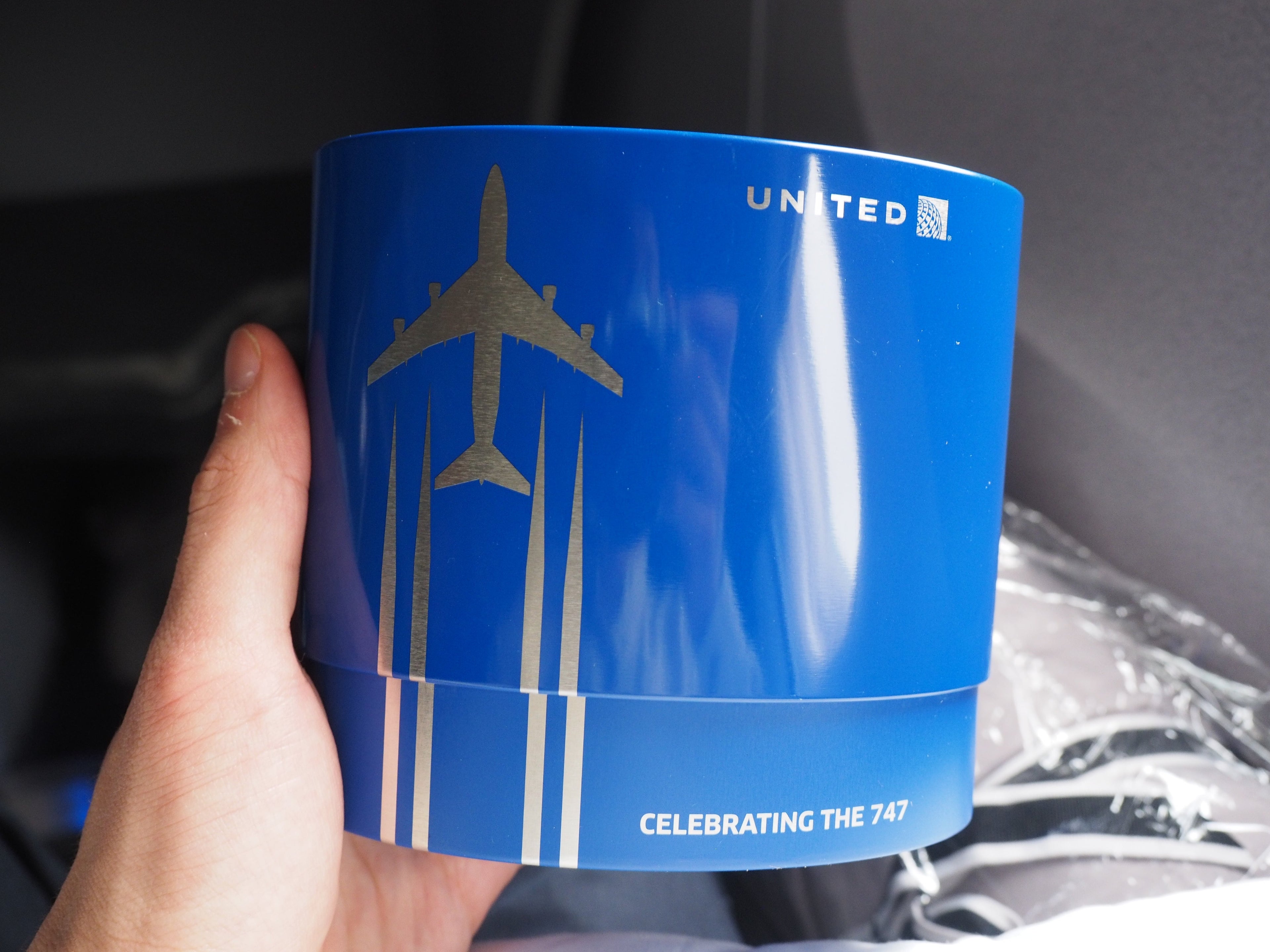 When I took this flight, United was still handing out 747-themed amenity kits in honor of the Queen of Skies' retirement from its fleet in 2017. Mine came in a blue metal cylinder, though others were gray.