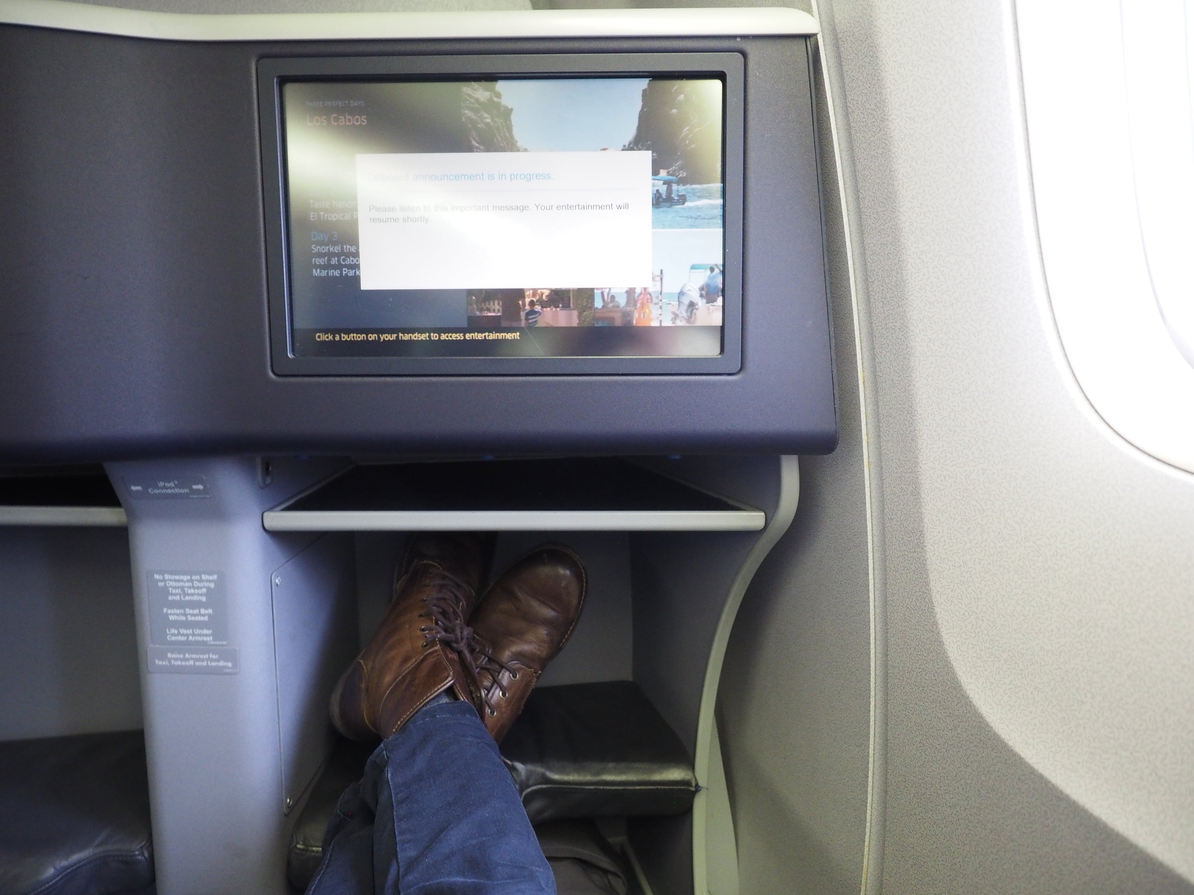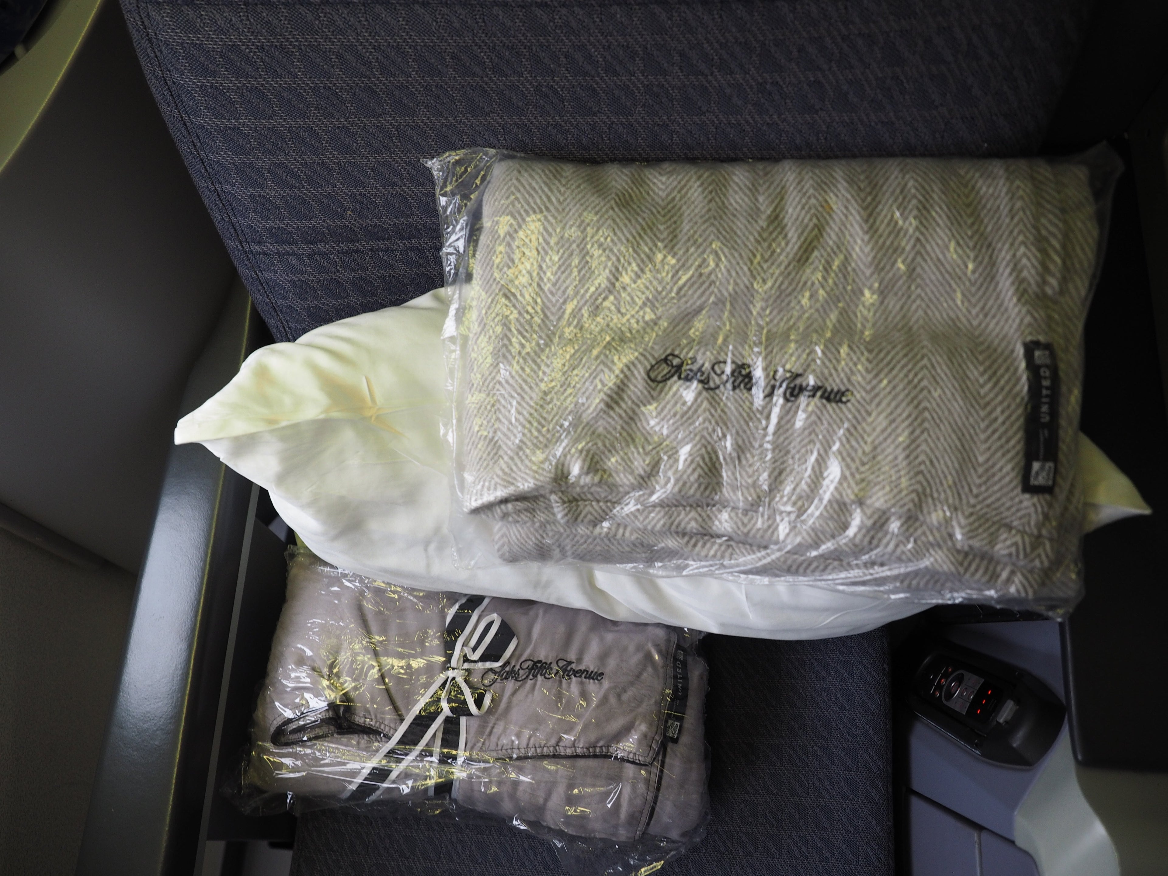 Since I was in Row 1, I could actually notice the curvature of the fuselage, which was pretty cool for this AvGeek. My seat was neither new nor squeaky clean, but it was comfortable. There were three sleep-related goodies waiting for me: a Saks Fifth Avenue blanket, comforter and full pillow.