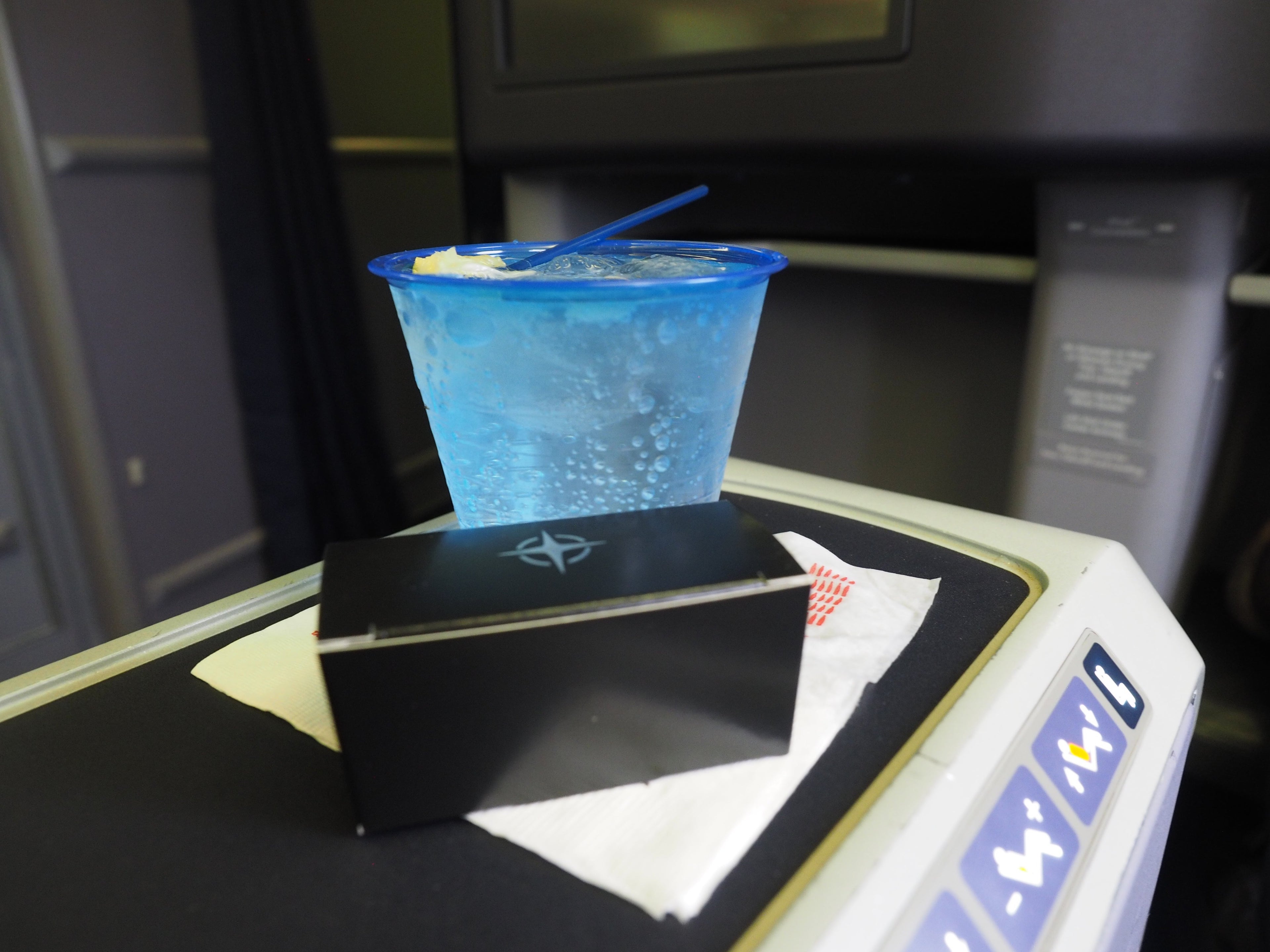 I was surprised to see the soda served in a plastic cup, especially given that many competitors serve beverages in true glasses on this route. In any case, a few minutes later, flight attendants came around to distribute menus.