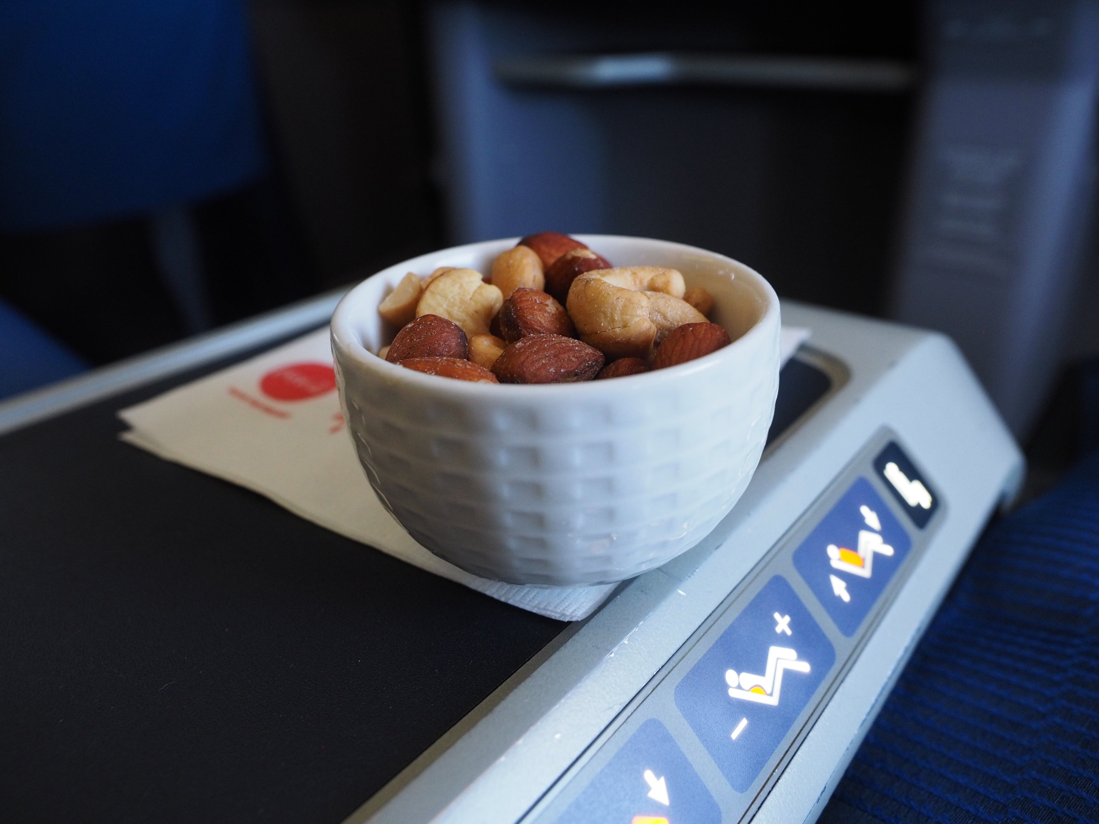 Lunch service began with a refreshing hot towel about 30 minutes after takeoff. Before I knew it, I was snacking on a mixture of warm nuts served in a Polaris-branded bowl.