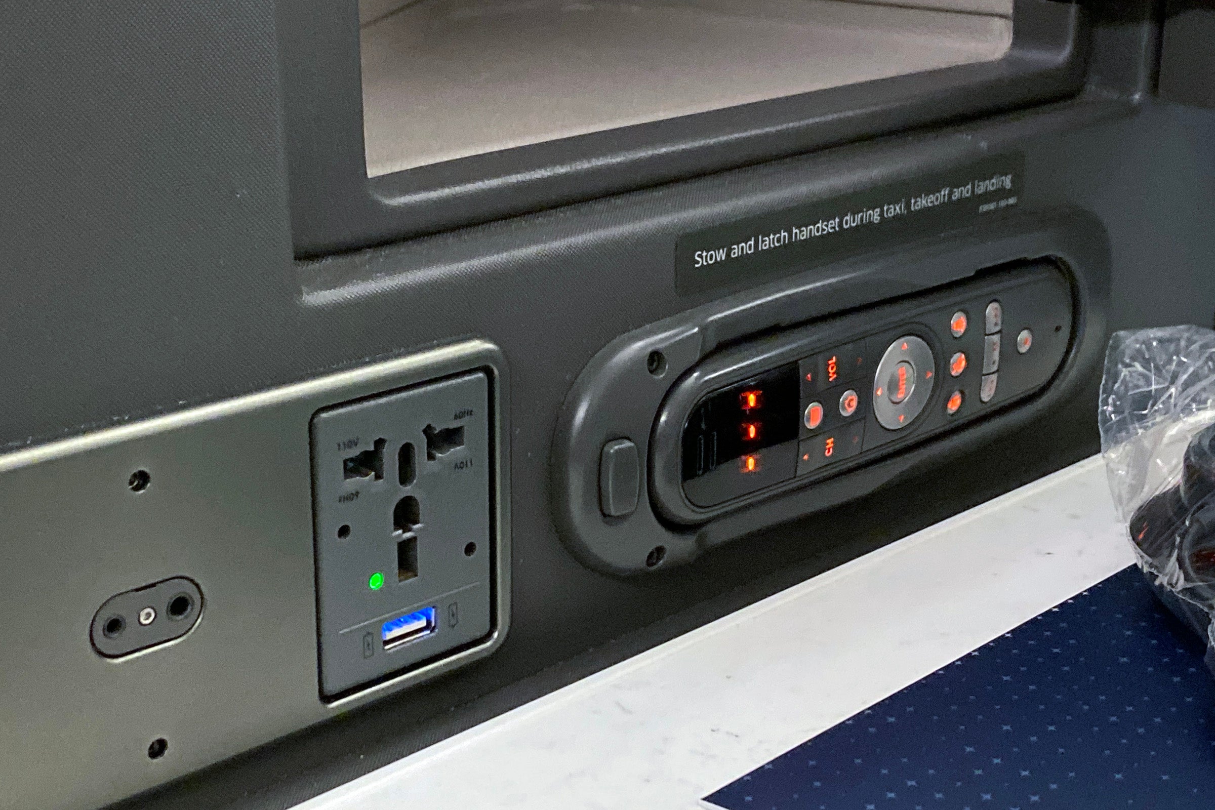 Each seat also has a universal power outlet, along with two USB charging ports: one above the side table and a second to the side of the TV.