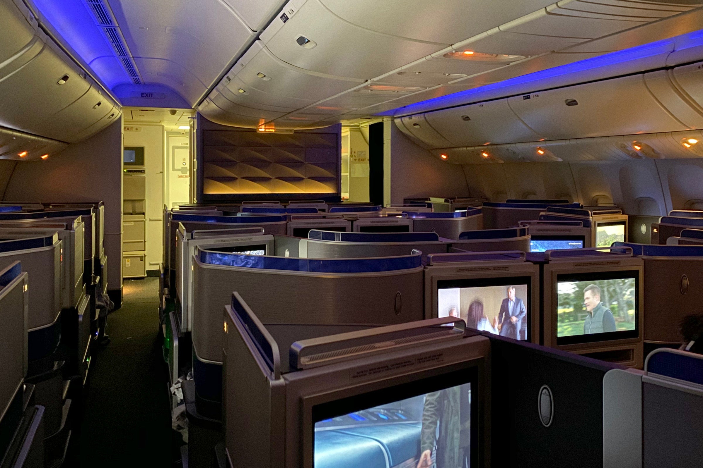 United's extended 777s feature a whopping 60 business-class seats spread between two cabins and arranged in a 1-2-1 configuration, with direct aisle access for all.