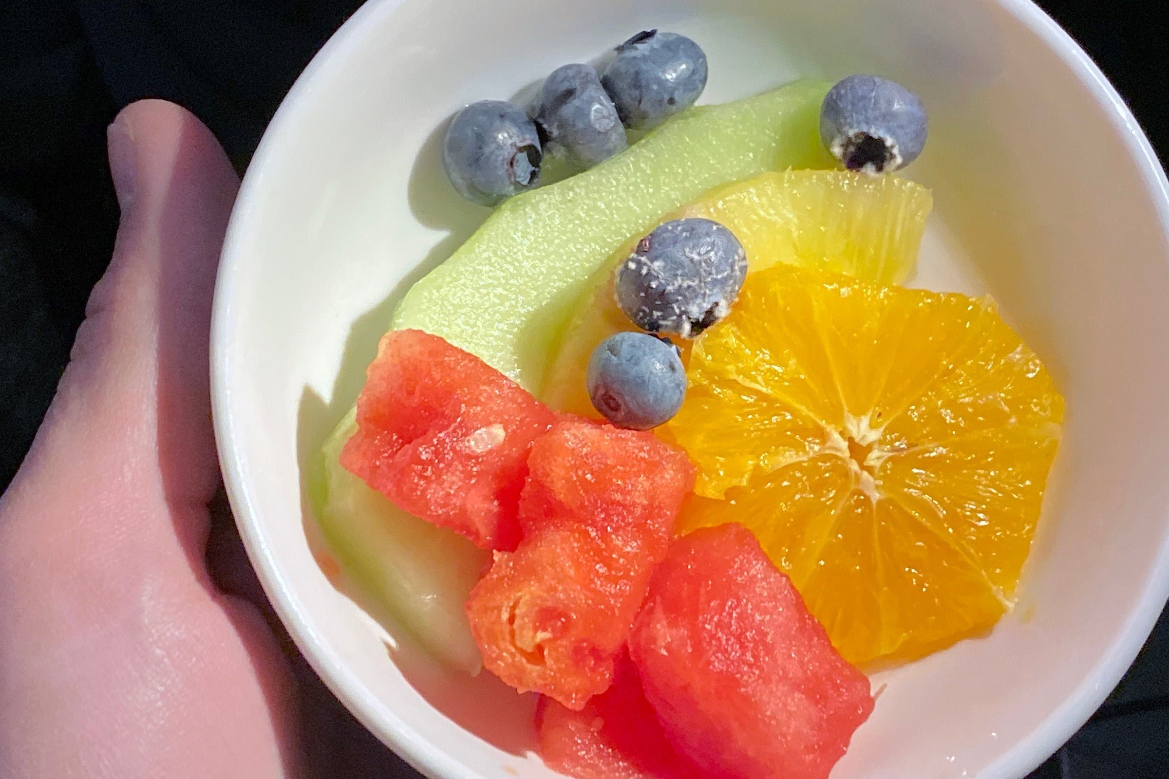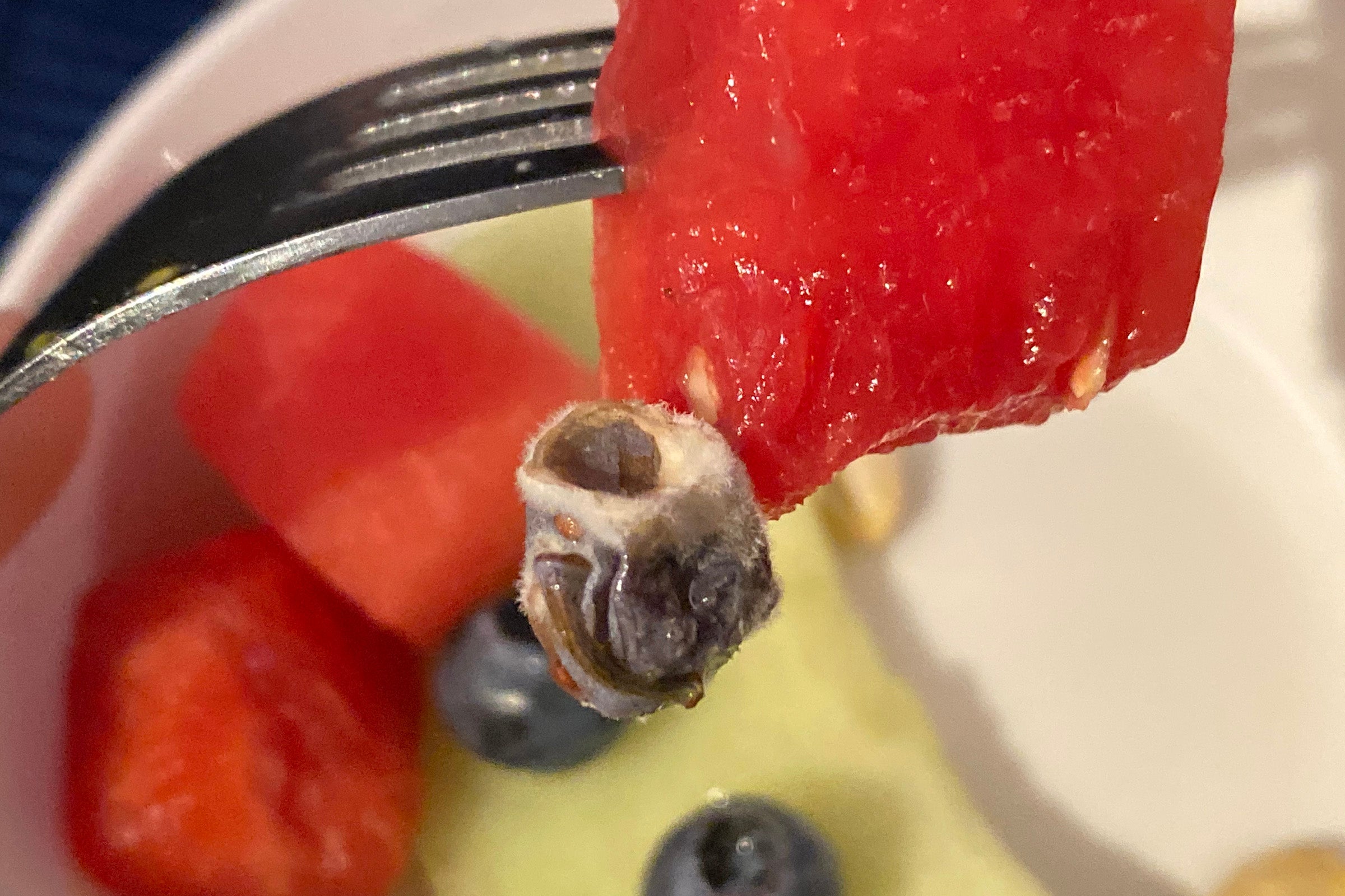 I started eating the fruit salad before noticing mold on a blueberry. It had actually grown to the point that it was stuck to the watermelon, so I imagine this fruit salad had been prepared far in advance of our flight. I pointed it out to a flight attendant, who took it away and offered me a travel voucher on the spot.