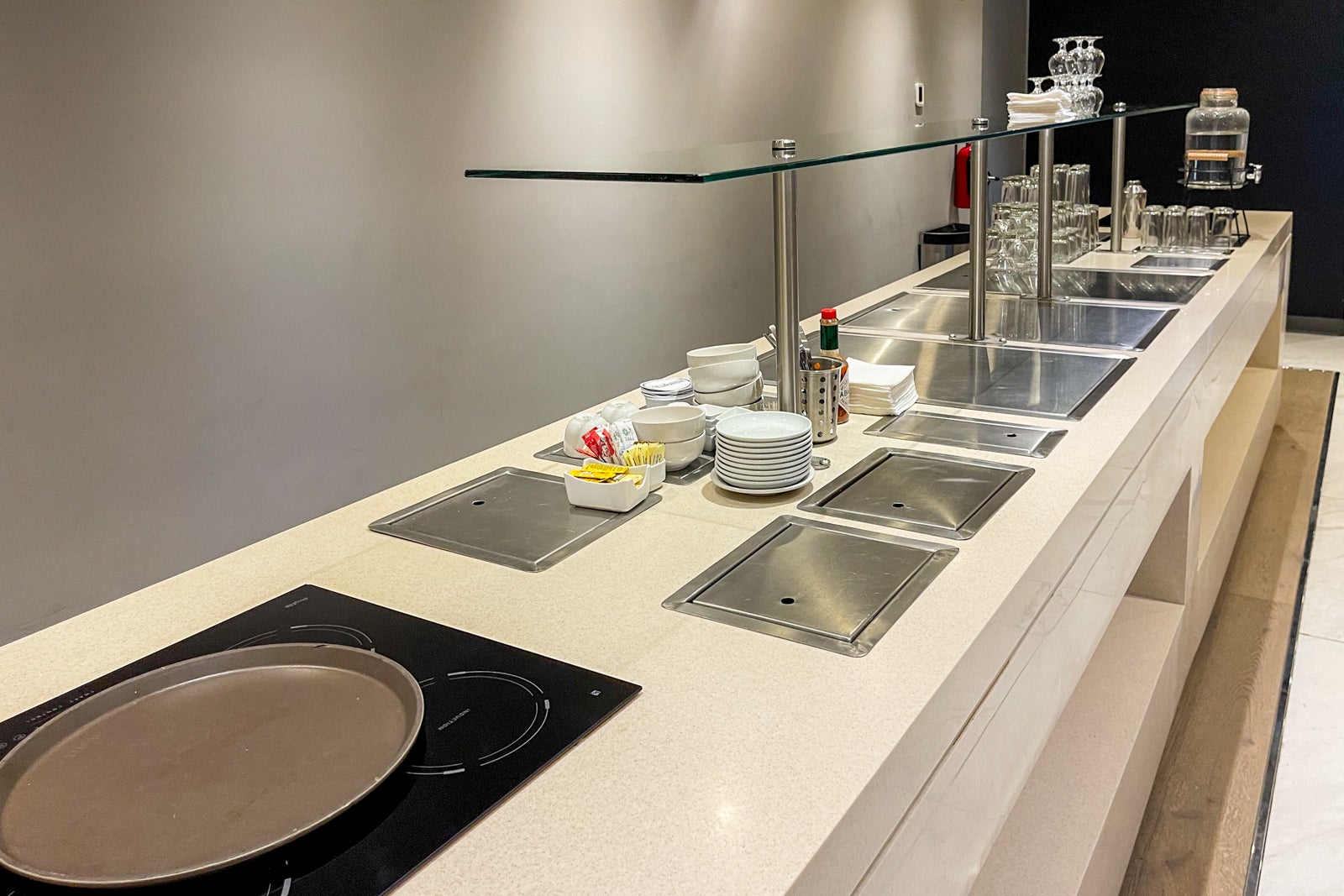 Despite a renovated lounge, the food options were limited, and there weren't many open seats. Quite a few passengers had abandoned their phones in remote corners of the lounge to charge them up since power outlets weren't conveniently located at each seat. With just a few tinted windows, the entire space felt a bit cramped.