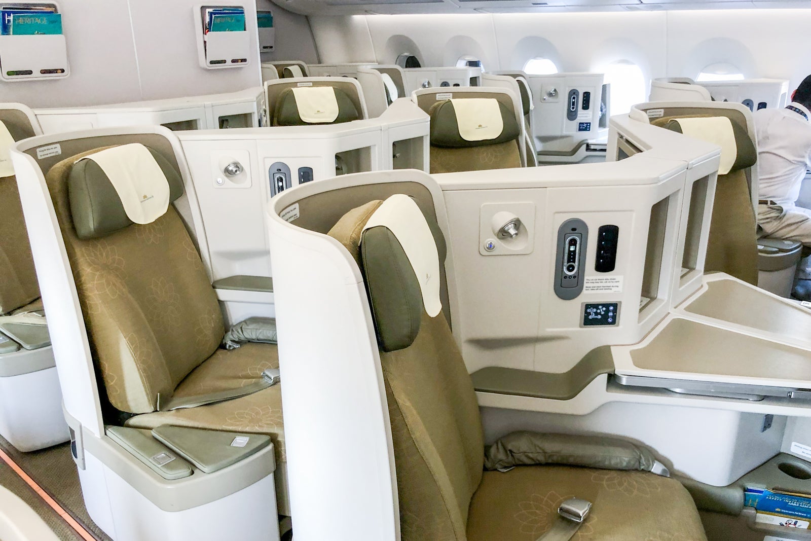 You will find 29 seats in business class on both versions of the Vietnam Airlines A350. Each passenger gets direct aisle access. On the version I flew, because all of the seats are angled inward, there isn't much buffer space between your shoulders and the aisle and there's not a lot of privacy.
