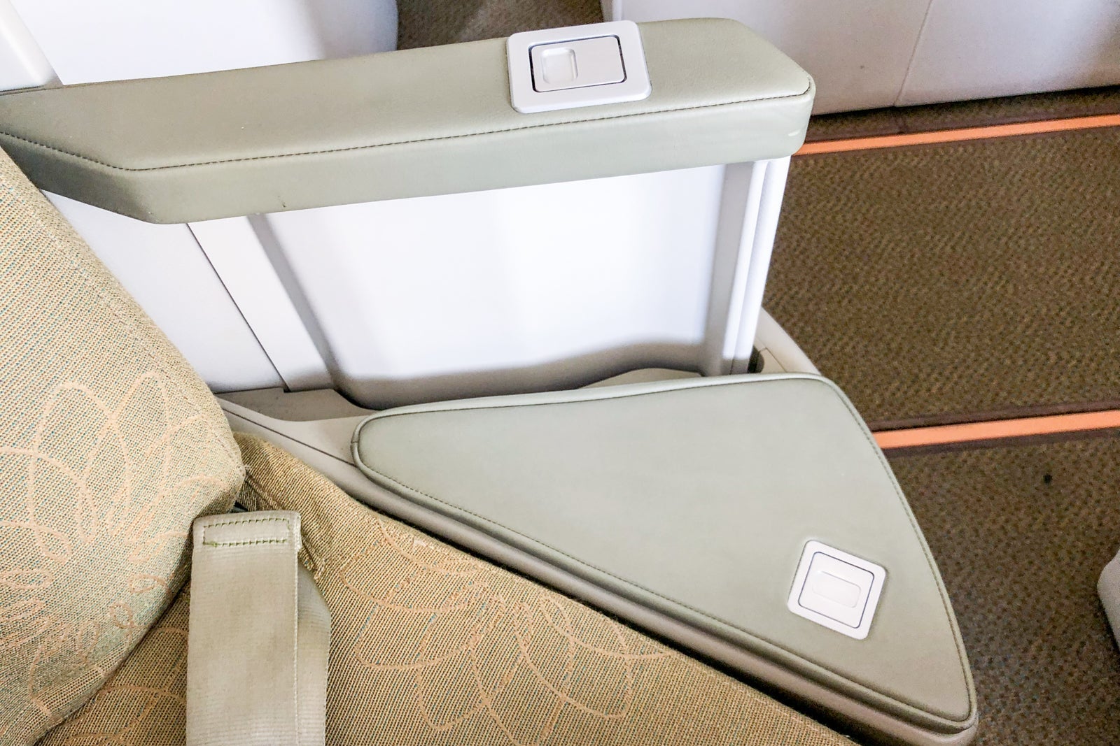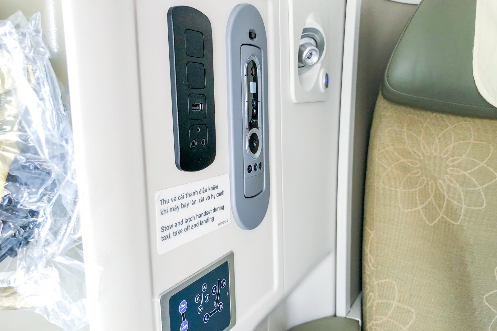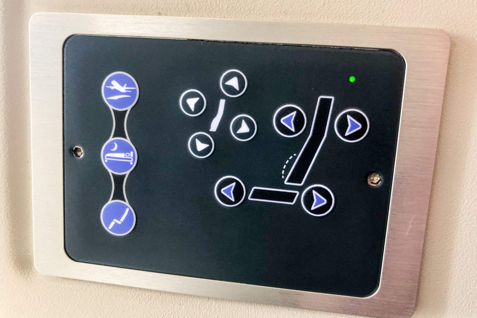 The seat controls are within easy reach. They have three preselected positions — upright for taxi, takeoff and landing, reclined and lie-flat — plus other controls for finer adjustments