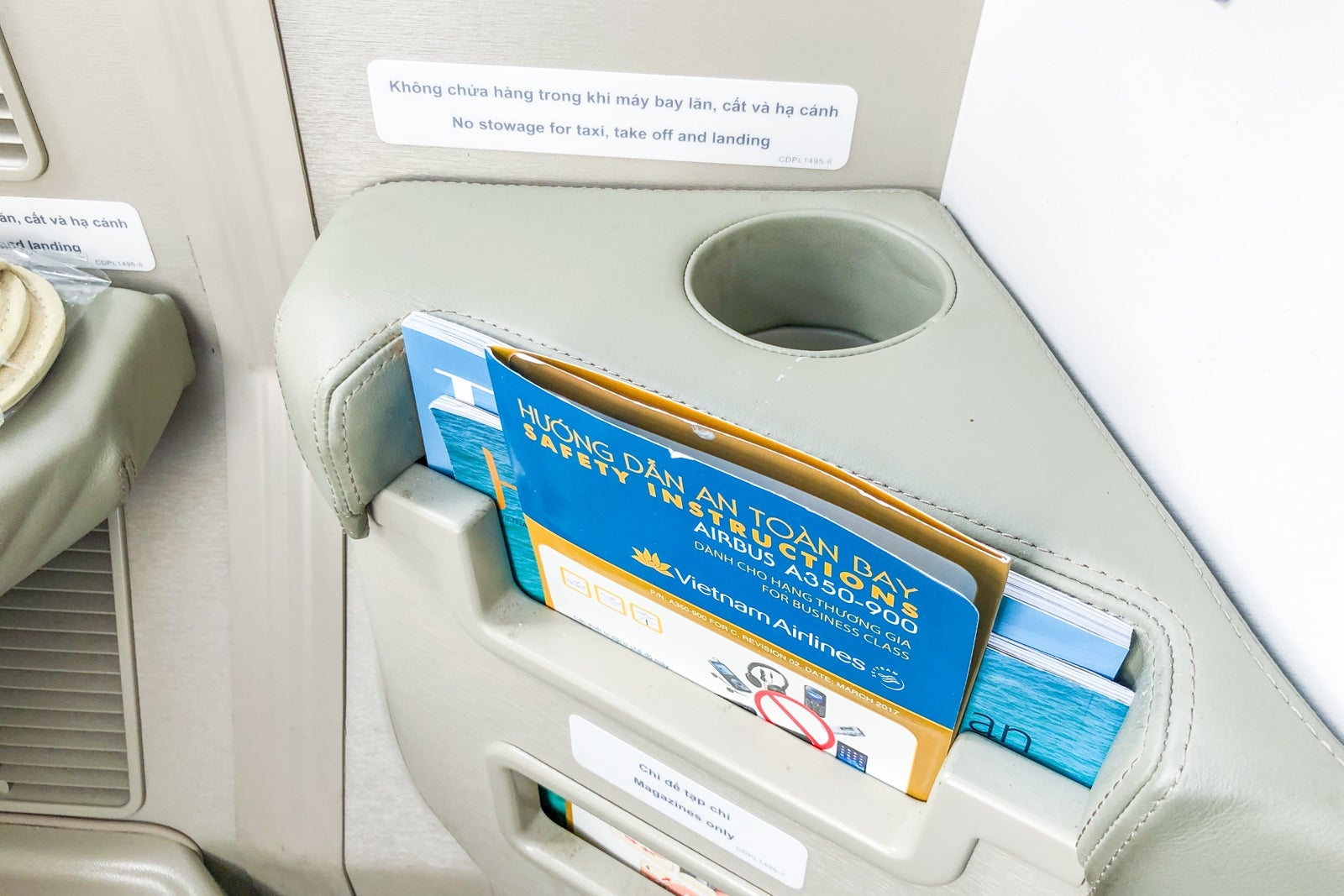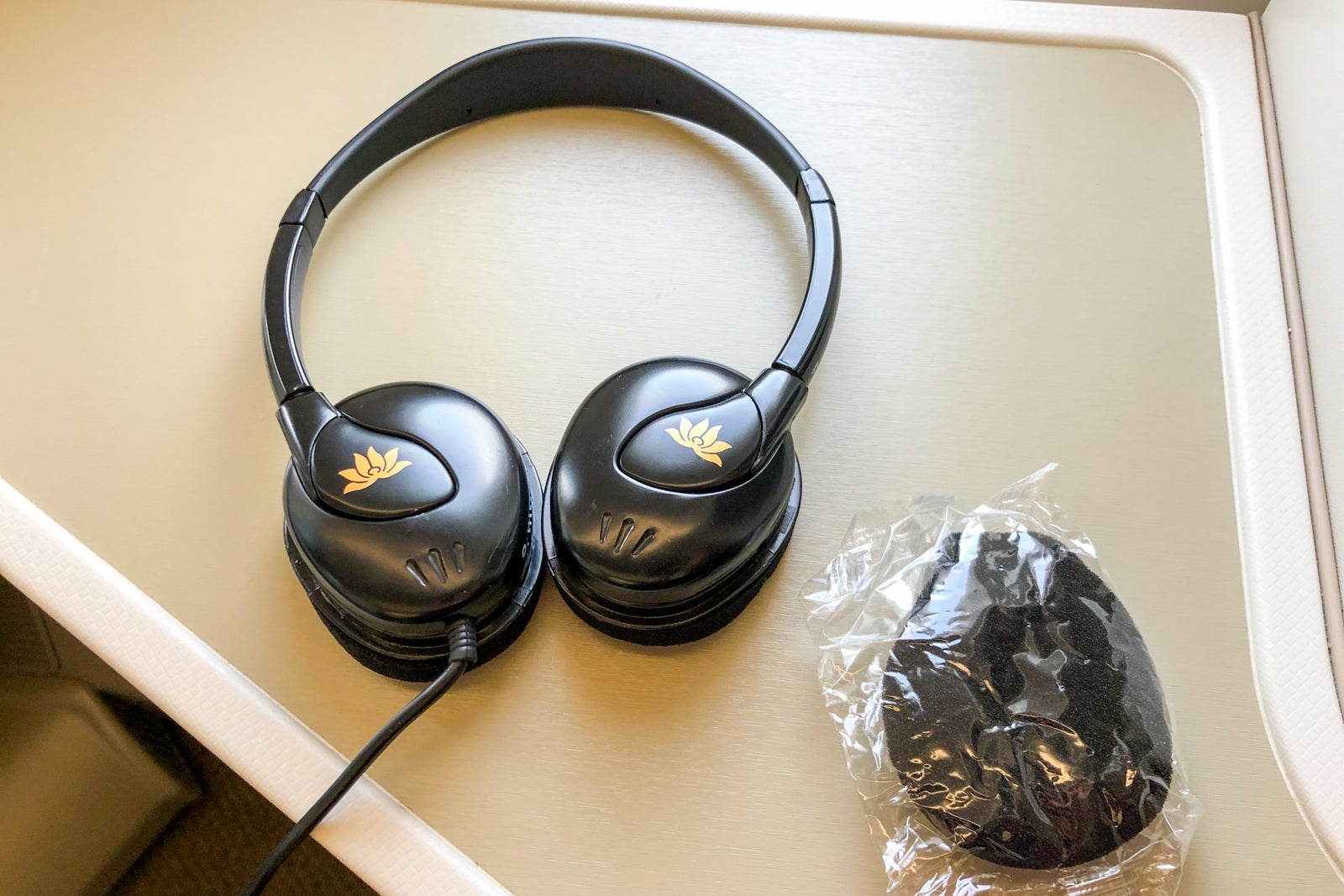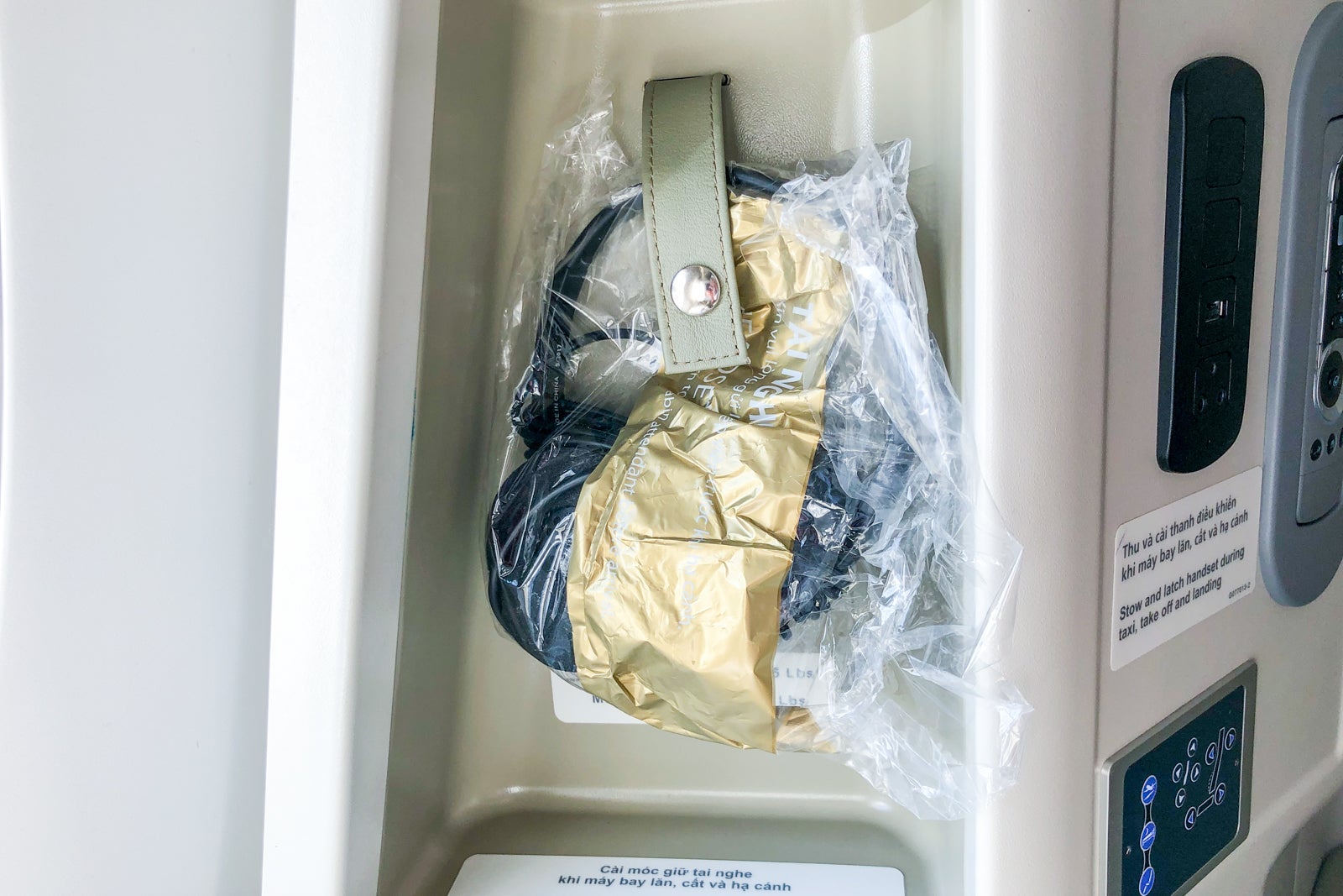 Inside the side cubby of each seat was a set of plastic-wrapped headphones. Emblazoned with the Vietnam Airlines logo, they didn't appear to be brand-name — and they sounded that way. They were not noise-canceling. Better headphones would be an easy improvement to the soft product.