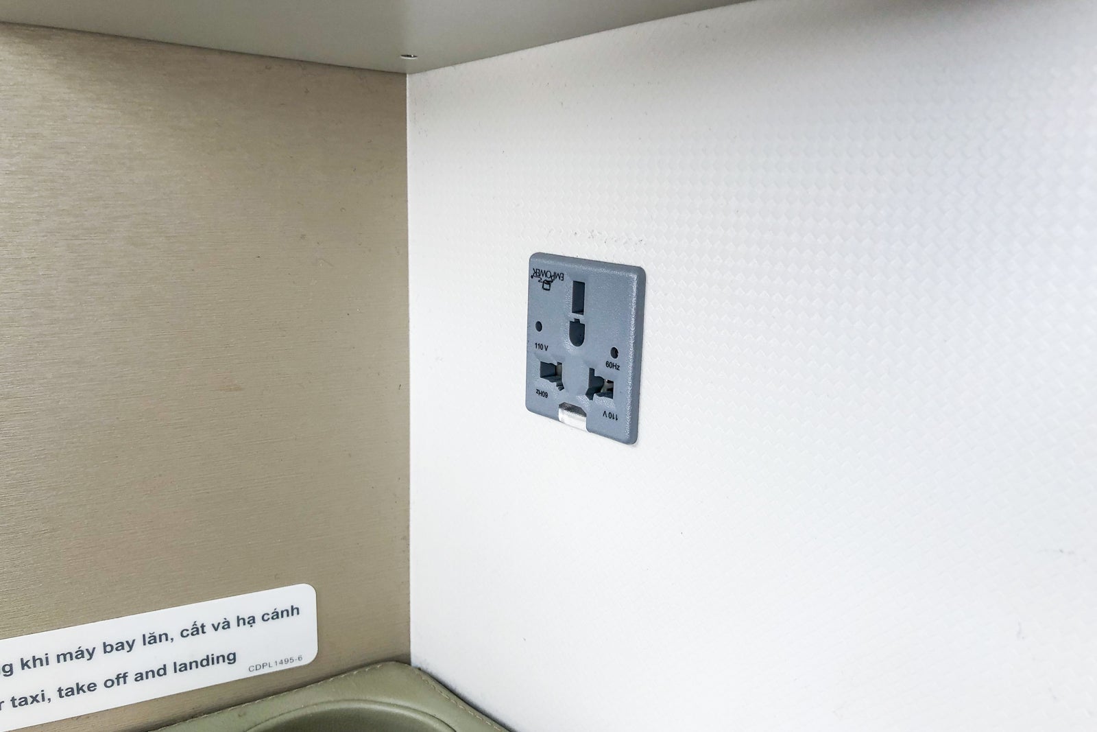 Each seat has a full universal power outlet next to the literature pocket and beverage holder.