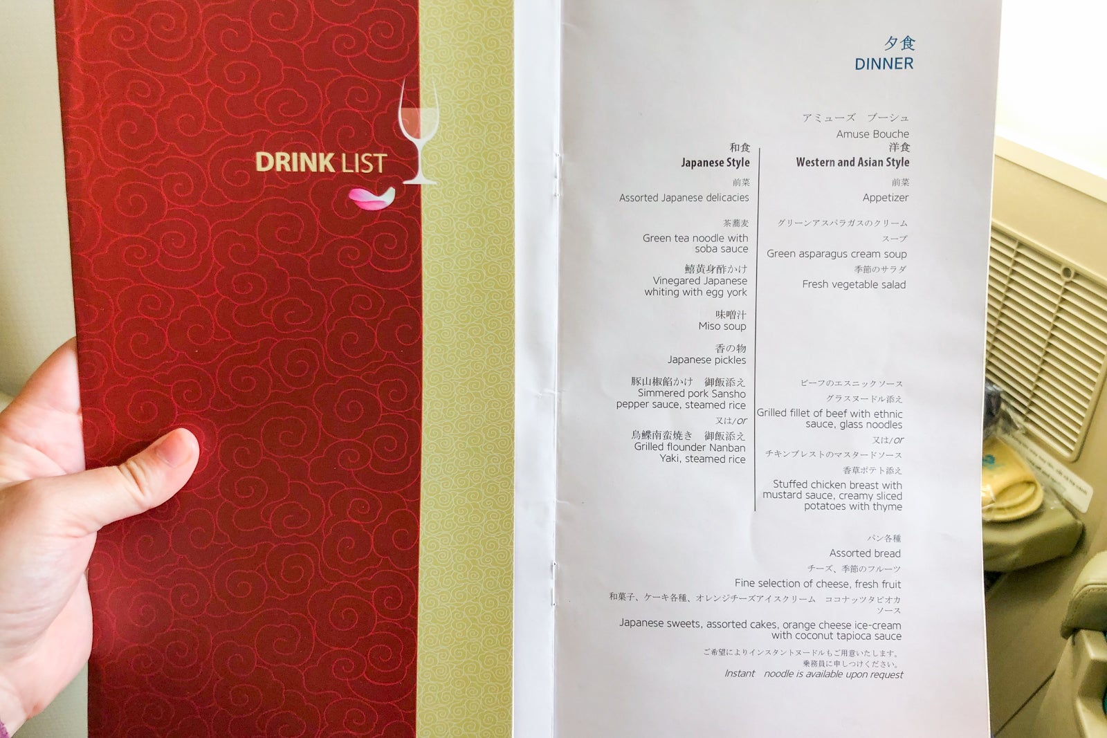 After the plane pushed back from the gate, flight attendants came around the cabin to take orders for drinks, appetizer, dinner and dessert. The dinner menu was split into Japanese style and "Western and Asian style." In general, the menu lacked descriptions — the Japanese appetizer was "assorted Japanese delicacies," while the other was just called "appetizer."
