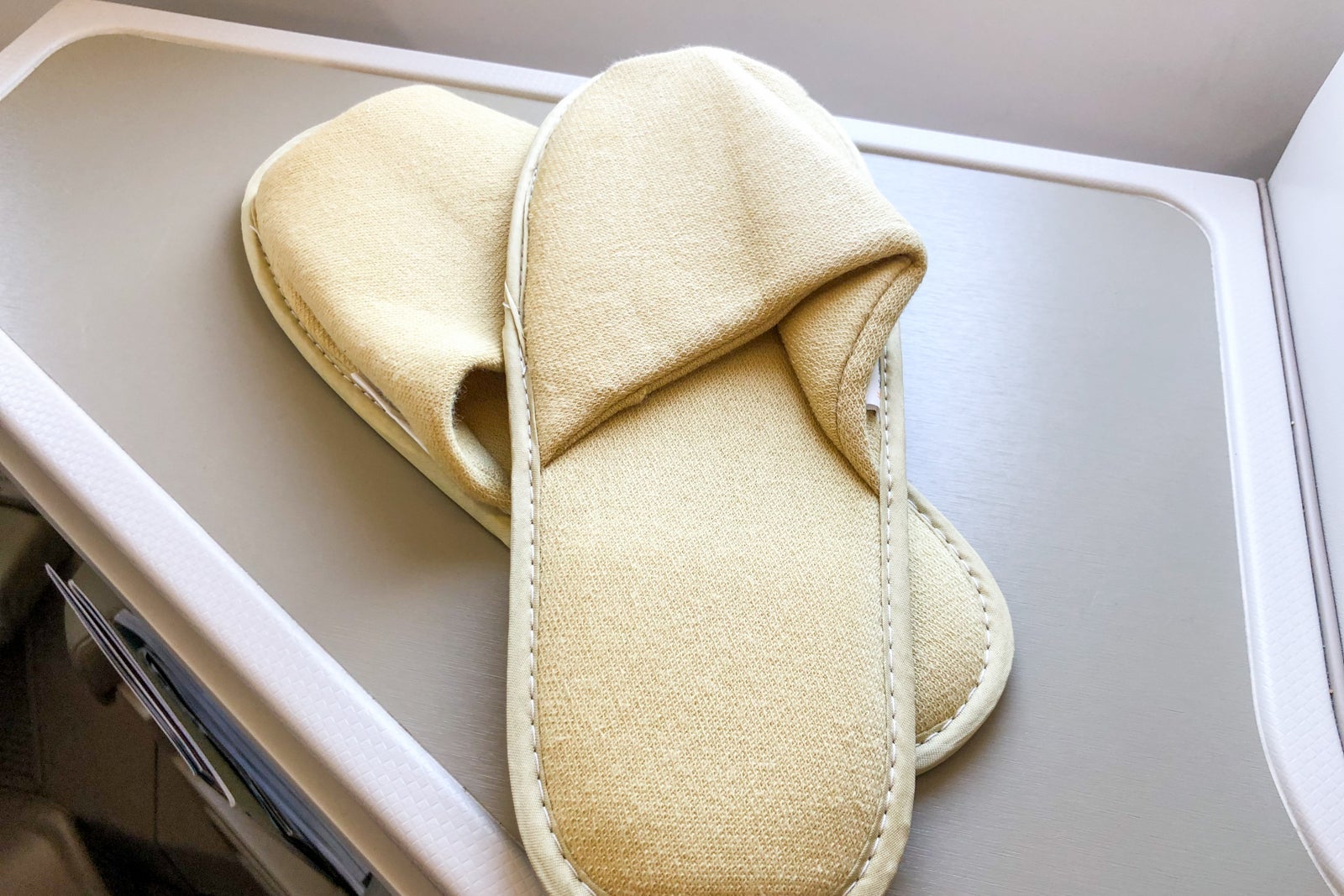 A pair of slippers was on each seat when passengers boarded the plane.